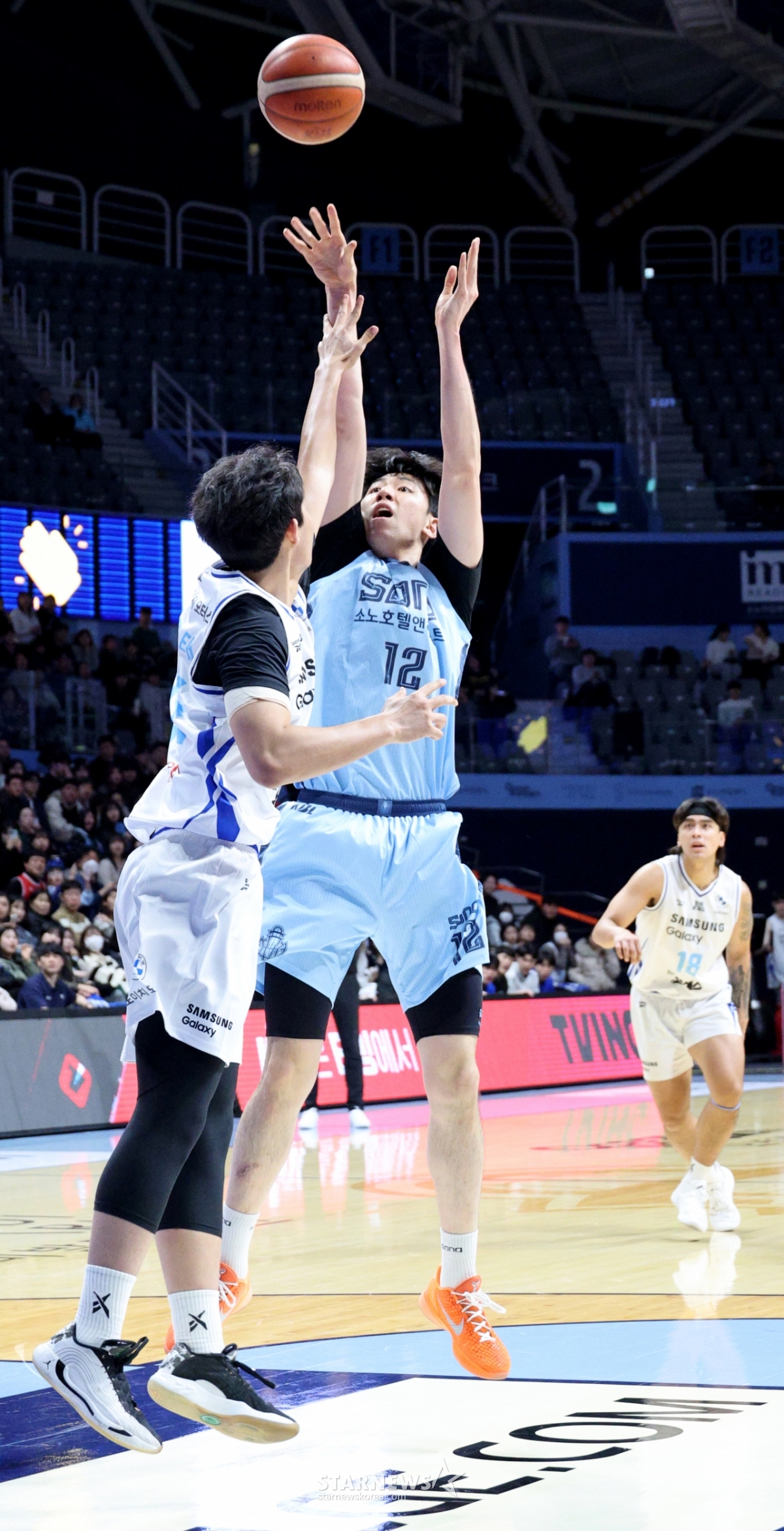 19日,在高阳索诺竞技场举行的2025-2026LG电子职业篮球高阳索诺和首尔三星队的比赛中,索诺姜志勋正在尝试跳投。 2026.02.19.