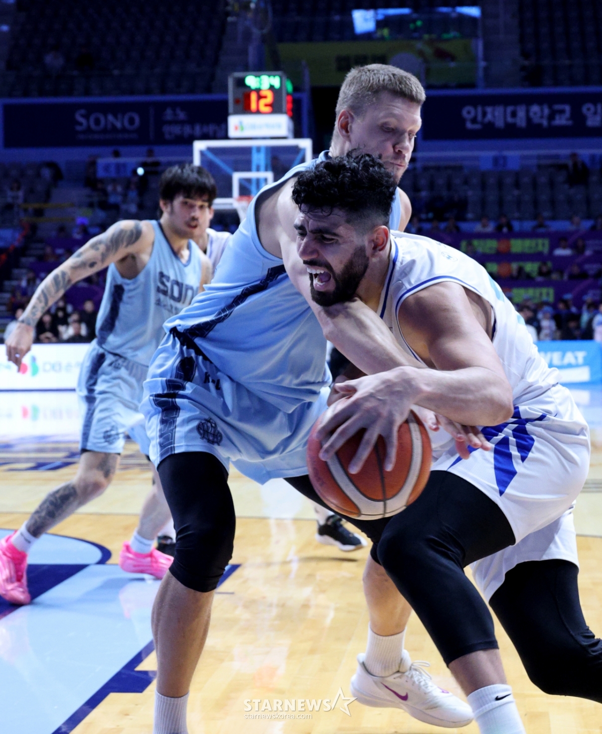 19日,在高阳索诺竞技场举行的2025-2026LG电子职业篮球高阳索诺和首尔三星的比赛中,三星坎特甩开伊吉迪斯,试图突破。 2026.02.19.