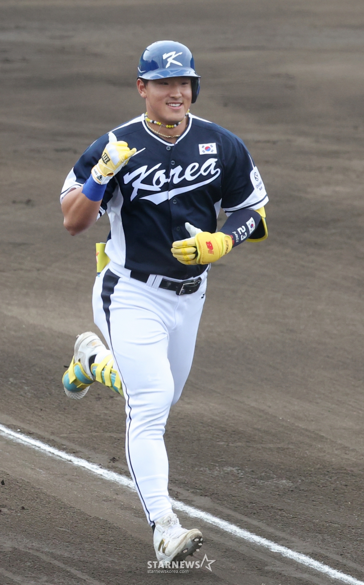图为代表队安贤民(音)在第1回合初面对三星队首发投手崔元泰(音)击出1分本垒打后正在回本垒。