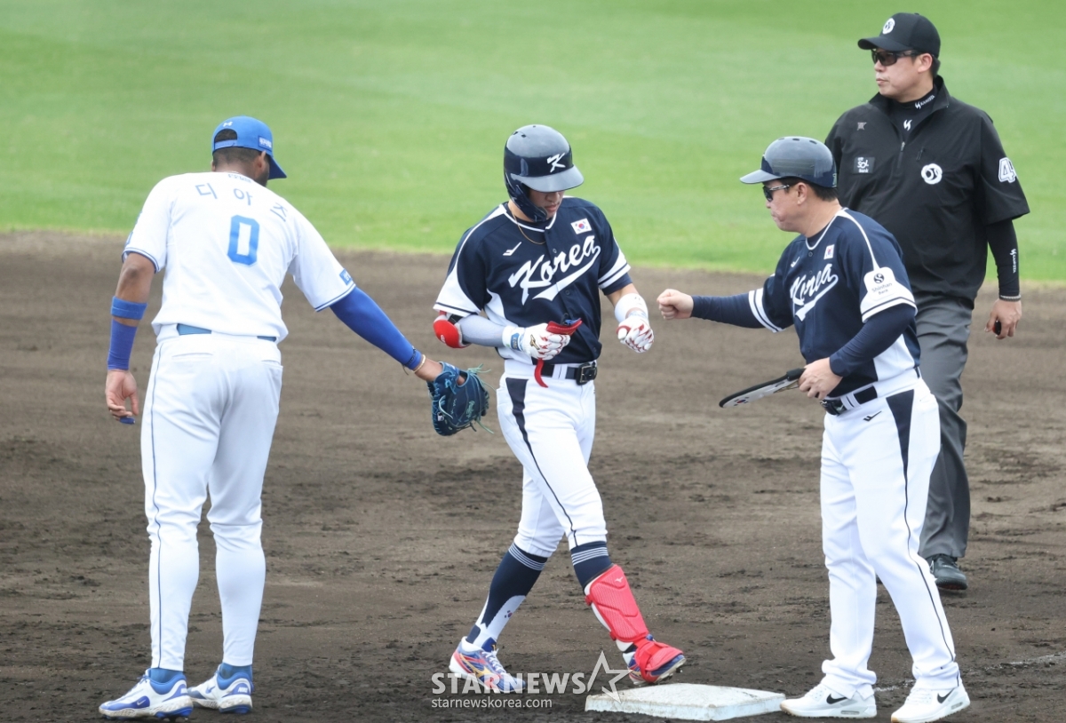 *此内容由AI翻译生成。WBC代表队20日在日本冲绳Onnason Akama球场与三星狮子队进行了练习赛。国家队朴海敏击出安打出垒后正在接受迪亚兹的祝贺© STARNEWS. 未经许可禁止转载或再分发*此内容由AI翻译生成。