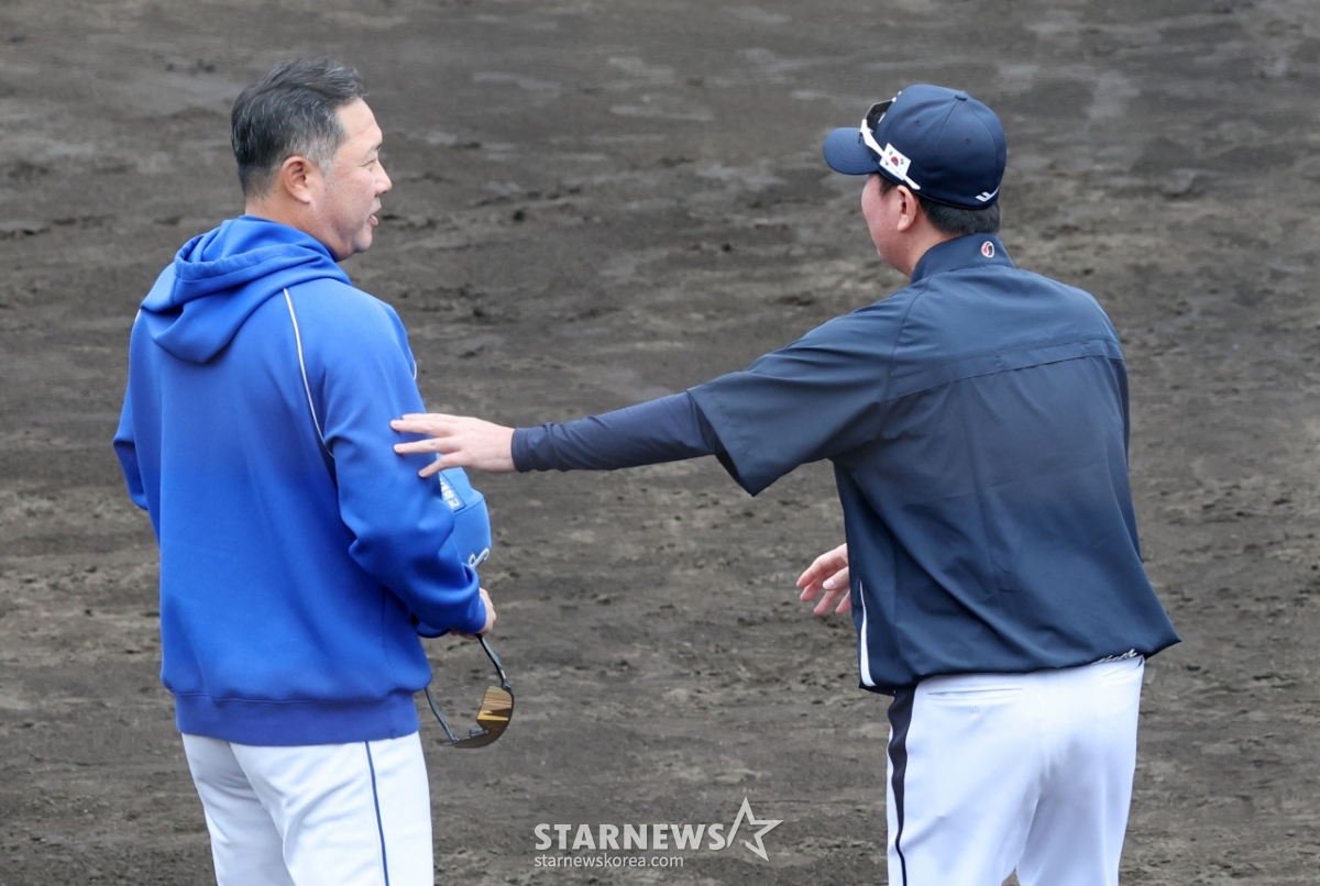 *此内容由AI翻译生成。WBC代表队19日在日本冲绳Onnason Akama球场与三星狮子队进行了练习赛。图为,国家队主教练柳智贤(右)在赛后与三星队主教练朴振万打招呼。© STARNEWS. 未经许可禁止转载或再分发*此内容由AI翻译生成。