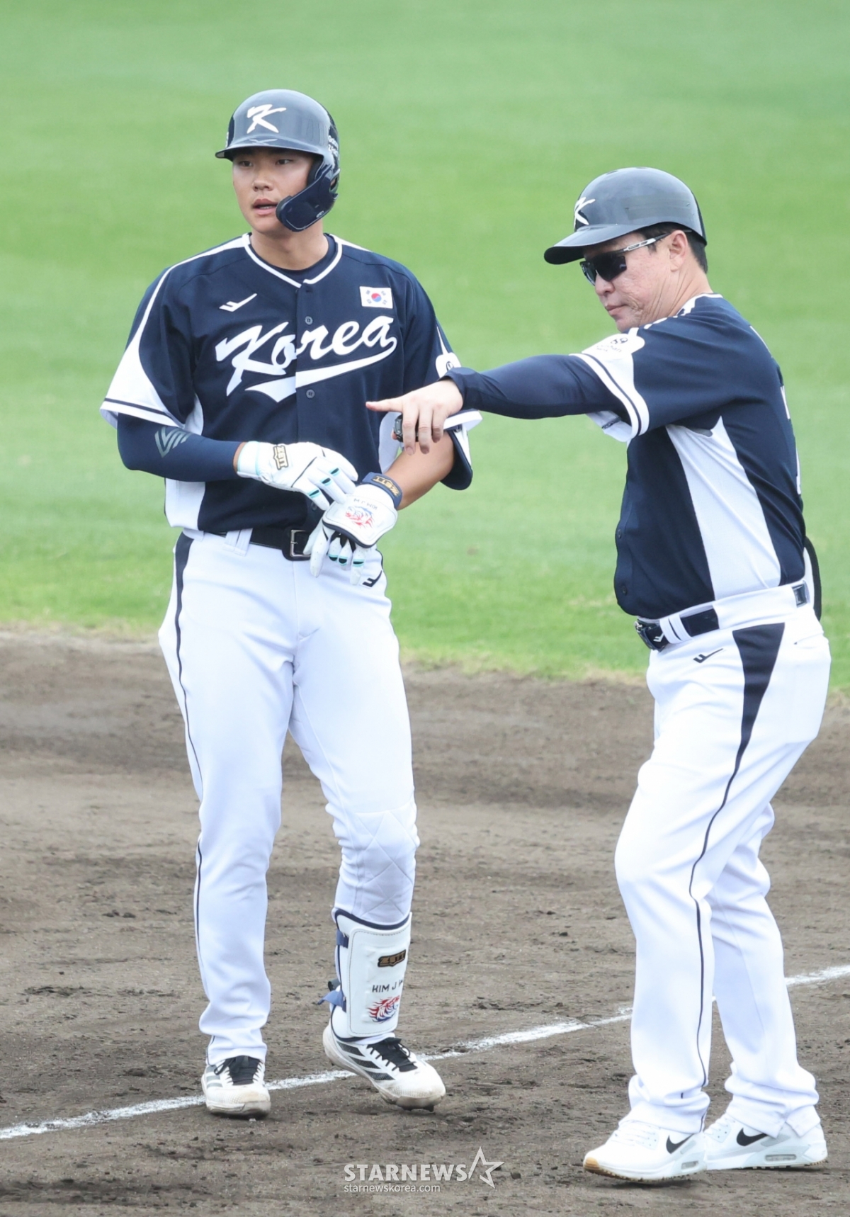 国家队金周元击出安打出垒后受到了李东旭教练的欢迎。