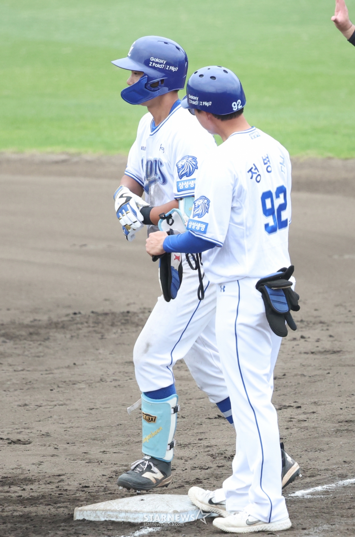 三星队的沈在勋击出安打出垒后受到了郑炳坤教练的欢迎。