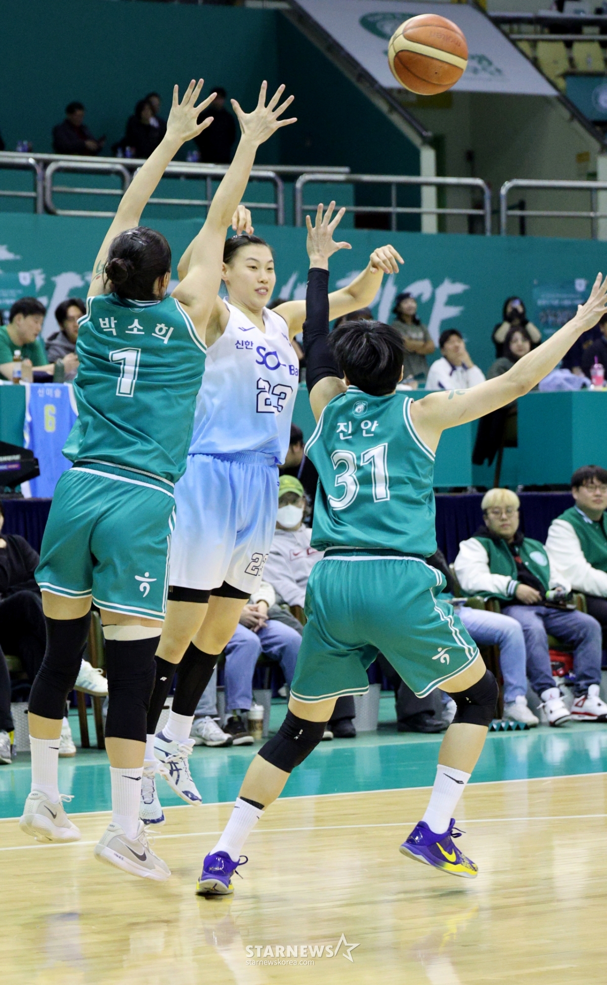 新韩洪有顺20日在富川室内体育馆举行的BNK金融2025-2026 WKBL韩亚银行和新韩银行比赛中传球。 2026.02.20.
