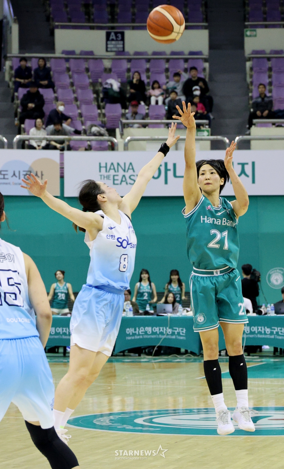 20日,韩亚佐基在富川室内体育馆举行的BNK金融2025-2026 WKBL韩亚银行和新韩银行比赛中,获得金智英的标志,正在尝试射门。 2026.02.20.