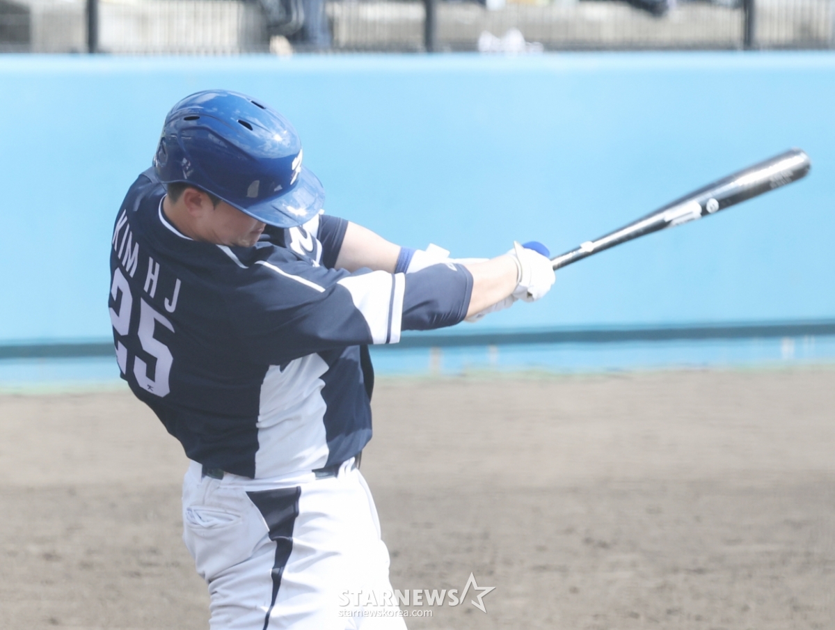 图为代表队的金亨俊(音)正在痛快淋漓地击球。