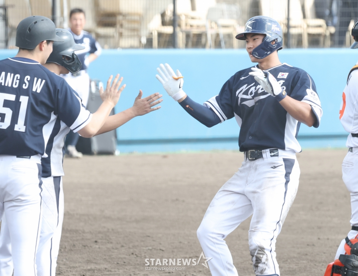 图为代表队金周元在第7回合初无人出局1、2垒有人的情况下,面对韩华队的黄俊书击出反败为胜的3分本垒打。