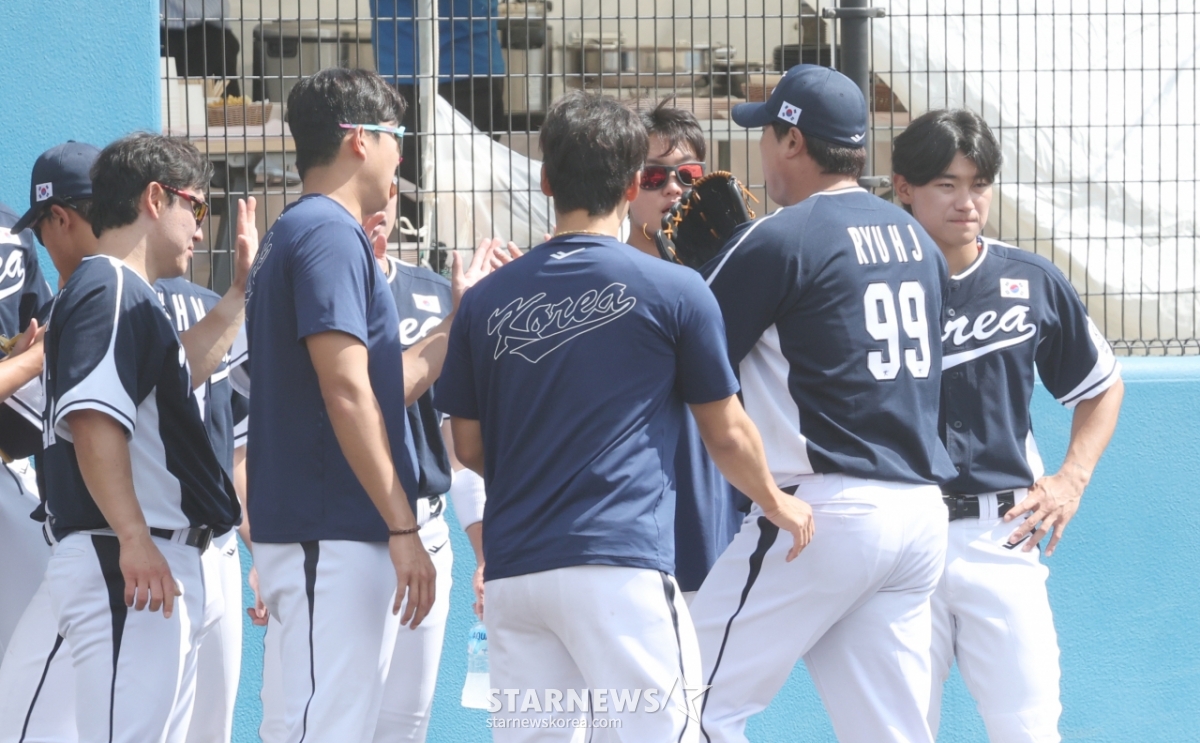 *此内容由AI翻译生成。WBC韩国棒球代表队21日在日本冲绳县八重江户球场与韩华鹰队进行了练习赛。国家队首发投手柳贤振结束第2回合投球后,在球员席上受到了队友们的欢迎。© STARNEWS. 未经许可禁止转载或再分发*此内容由AI翻译生成。