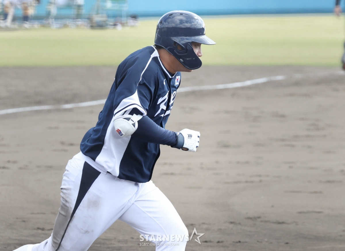 *此内容由AI翻译生成。WBC韩国棒球代表队21日在日本冲绳县八重江户球场与韩华鹰队进行了练习赛。图为,文宝璟奋力击球后正在疾驰。© STARNEWS. 未经许可禁止转载或再分发*此内容由AI翻译生成。