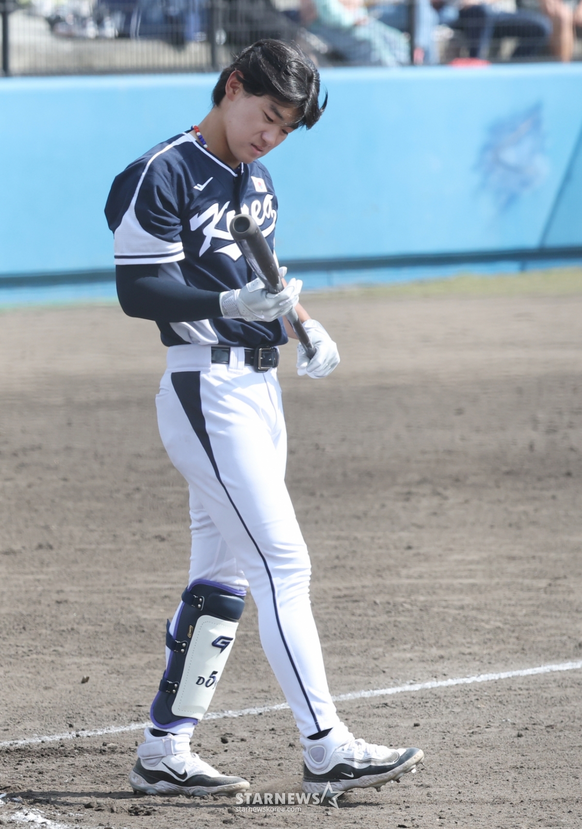 图为代表队金道英(音)在第6回合初用力打空后正在抚摸球棒。