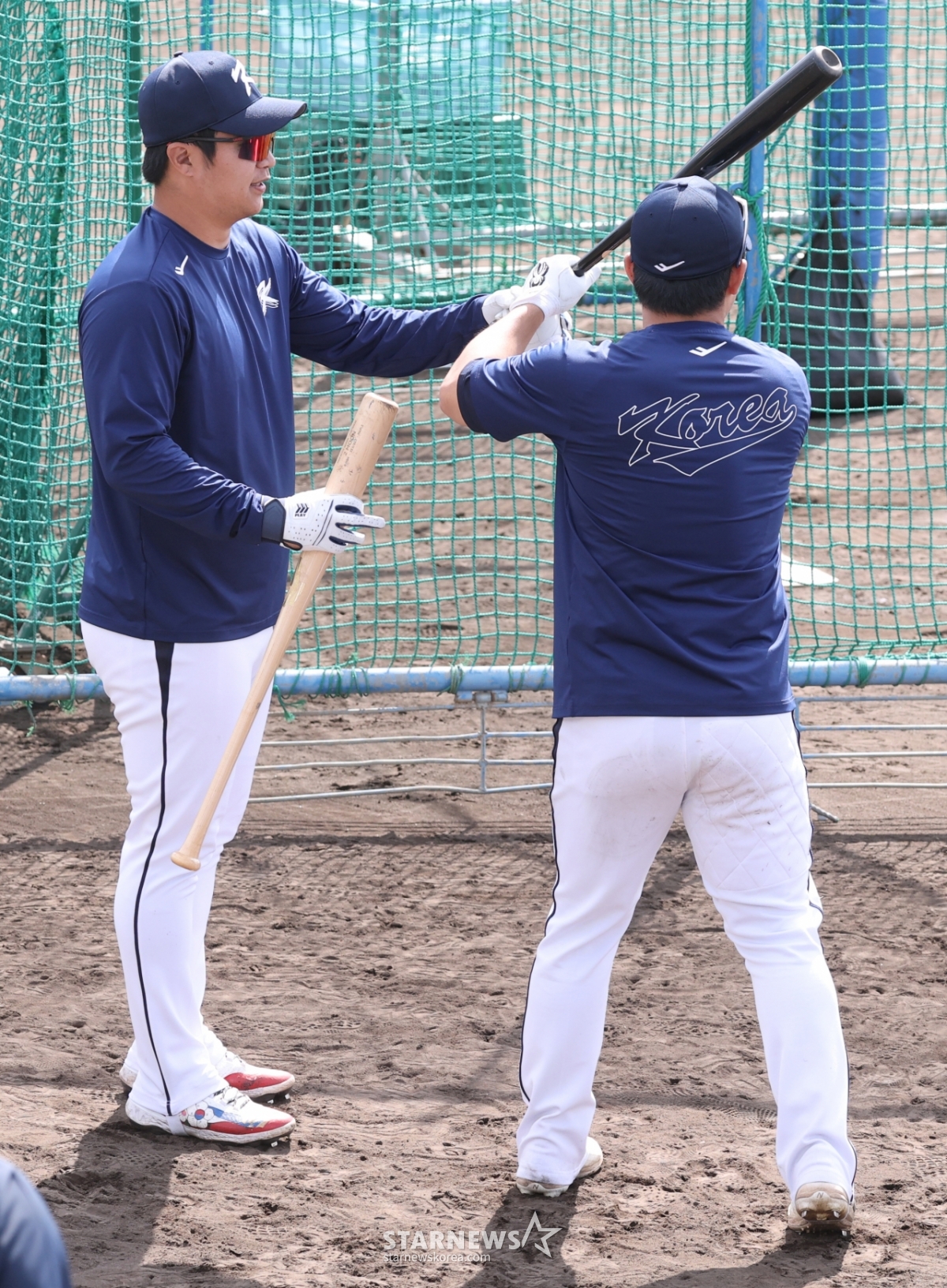 *此内容由AI翻译生成。WBC韩国棒球代表队21日在日本冲绳县八重江户球场与韩华鹰队进行了练习赛。图为文宝京(音)正在纠正文玄彬(音)的击球姿势。© STARNEWS. 未经许可禁止转载或再分发*此内容由AI翻译生成。