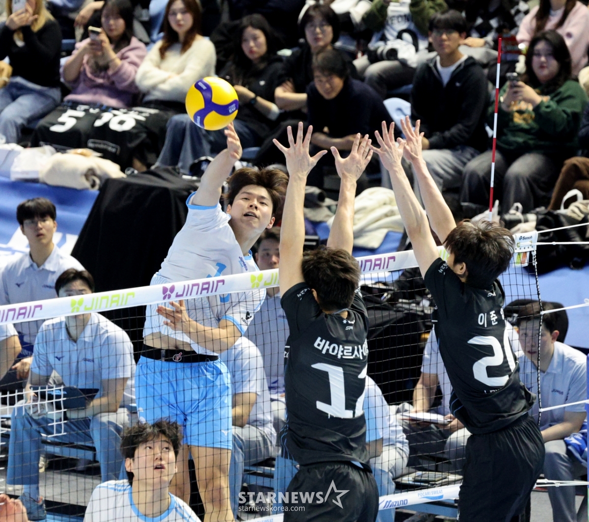 22日,大韩航空郑汉勇(音)在桂阳体育馆举行的真航空2025-2026V联赛大韩航空和现代资本队的比赛中,突破了现代双重任意球。 2026.02.202.