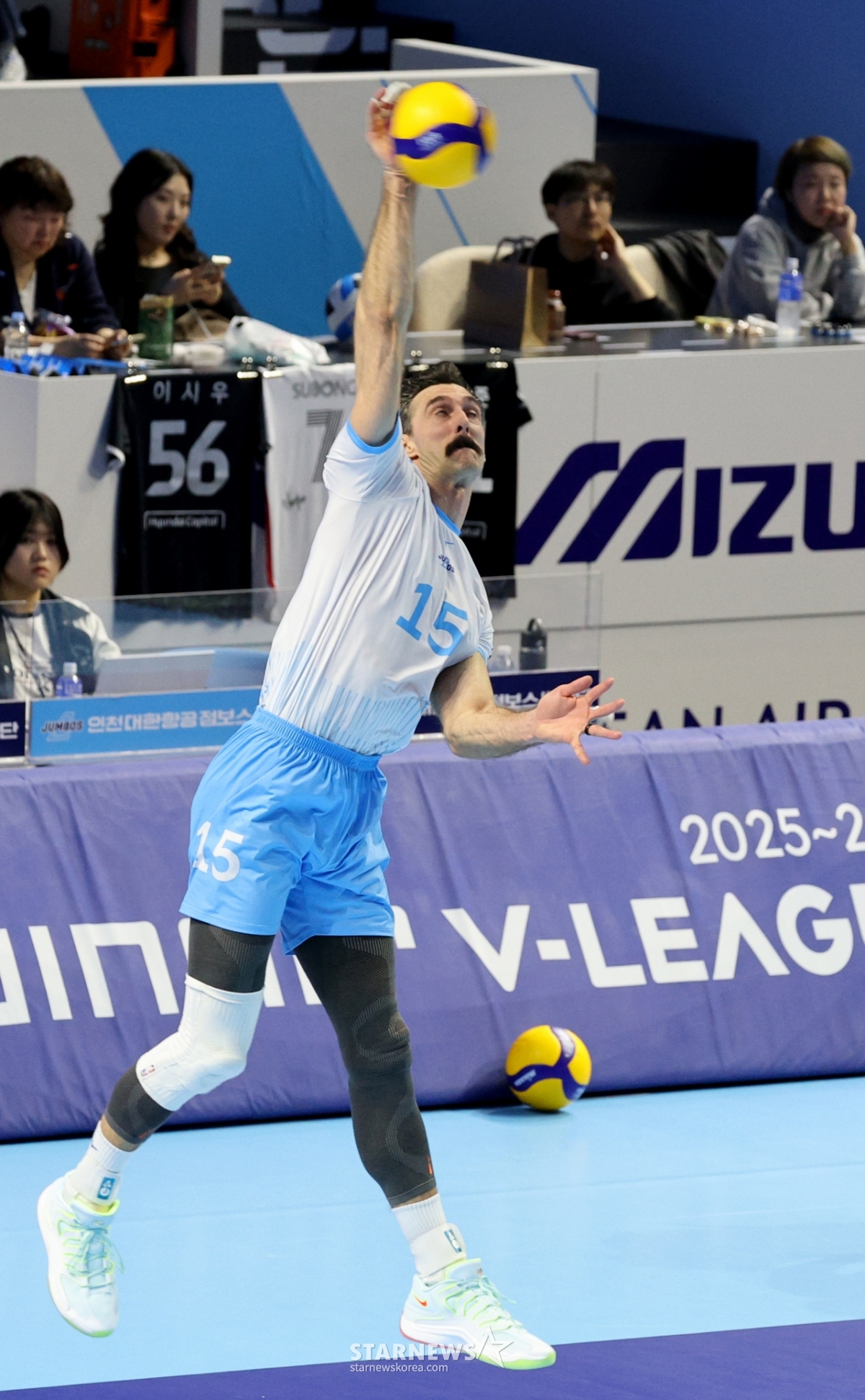*此内容由AI翻译生成。22日,大韩航空Russell在桂阳体育馆举行的真航空2025-2026V联赛大韩航空和现代资本队的比赛中,正在尝试扣球发球。 2026.02.202.© STARNEWS. 未经许可禁止转载或再分发*此内容由AI翻译生成。