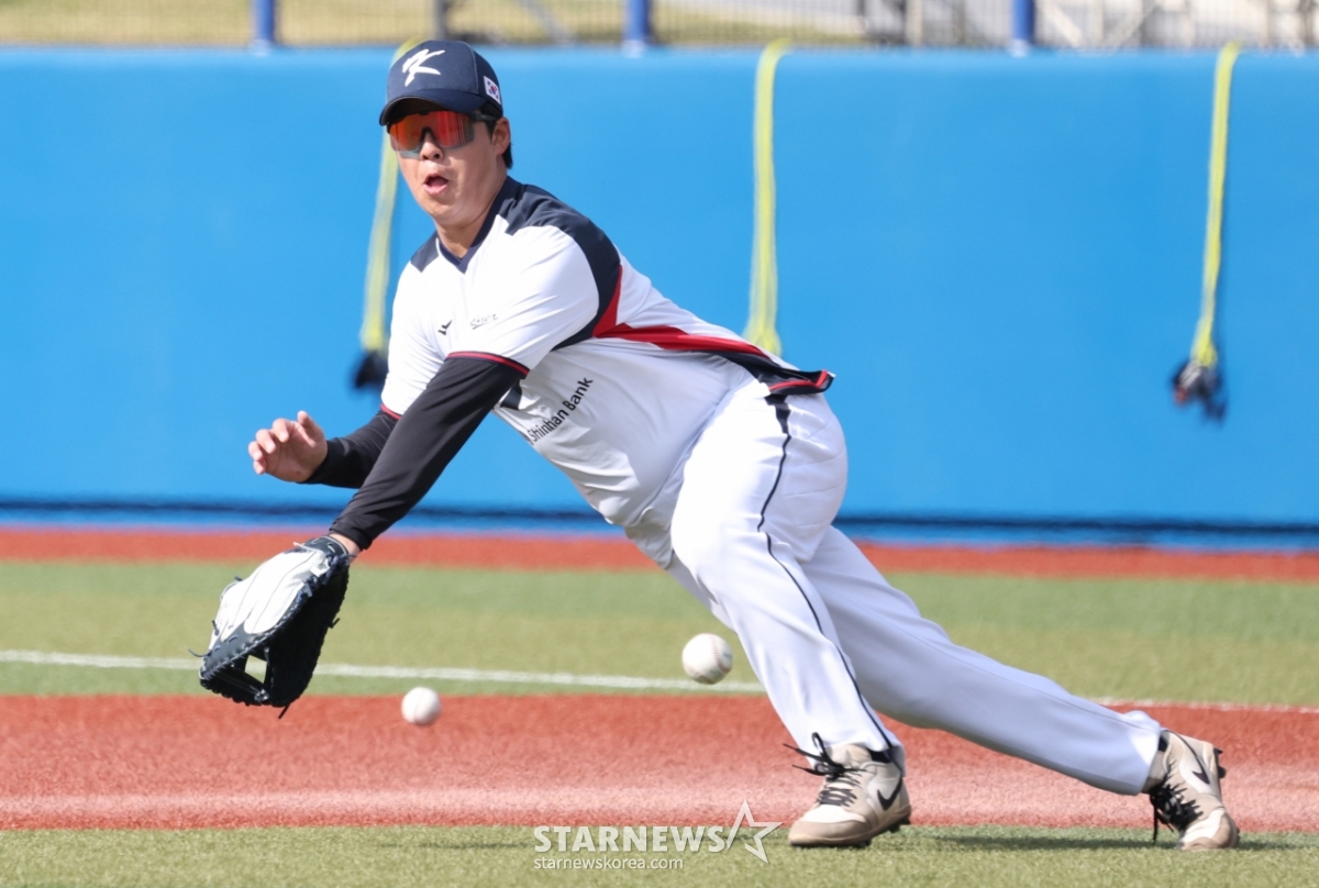 *此内容由AI翻译生成。23日,WBC韩国棒球队在日本冲绳县卡德纳棒球场与韩华鹰队进行了练习赛。图为代表队的卢时焕正在进行防守训练。© STARNEWS. 未经许可禁止转载或再分发*此内容由AI翻译生成。
