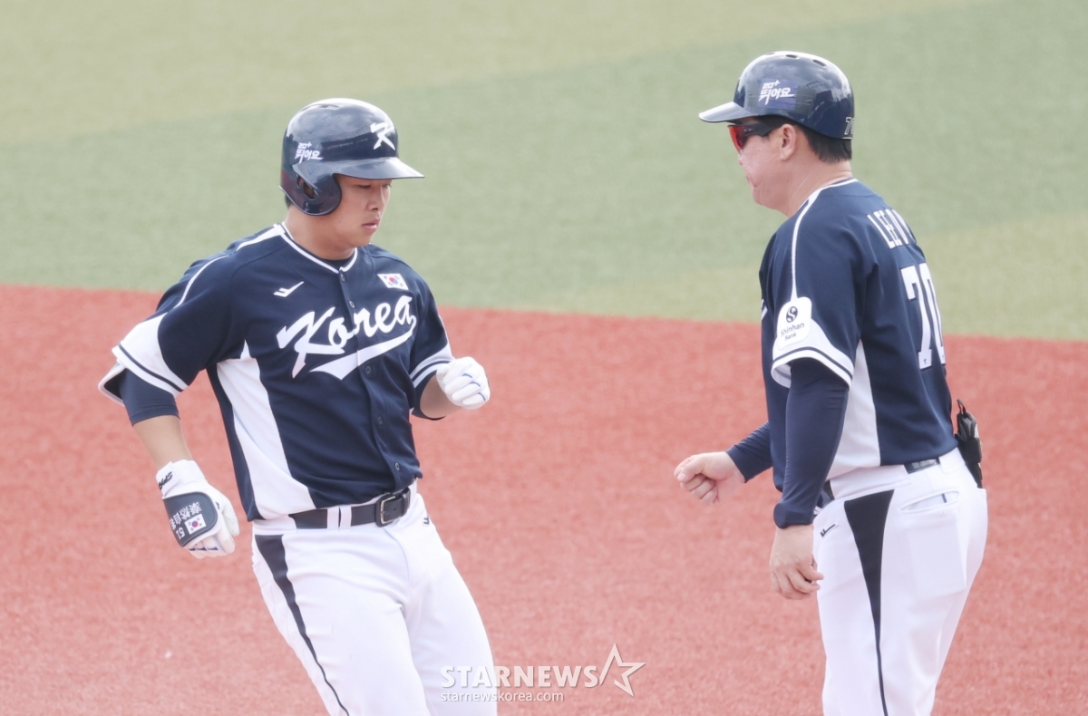 代表队文玄彬在第7回合初无人出局2、3垒有人的情况下,击出反败为胜的2打点适时安打出垒后,受到了李东旭教练的欢迎。