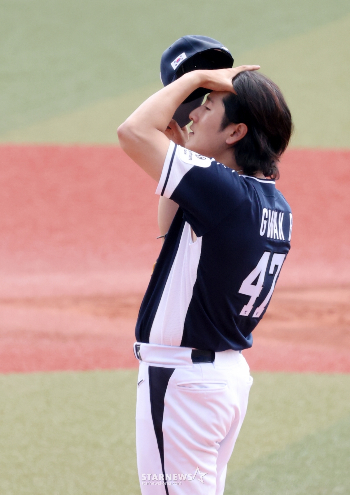 *此内容由AI翻译生成。23日,WBC韩国棒球队在日本冲绳县卡德纳棒球场与韩华鹰队进行了练习赛。图为,国家队首发队员郭彬正在改戴帽子。© STARNEWS. 未经许可禁止转载或再分发*此内容由AI翻译生成。