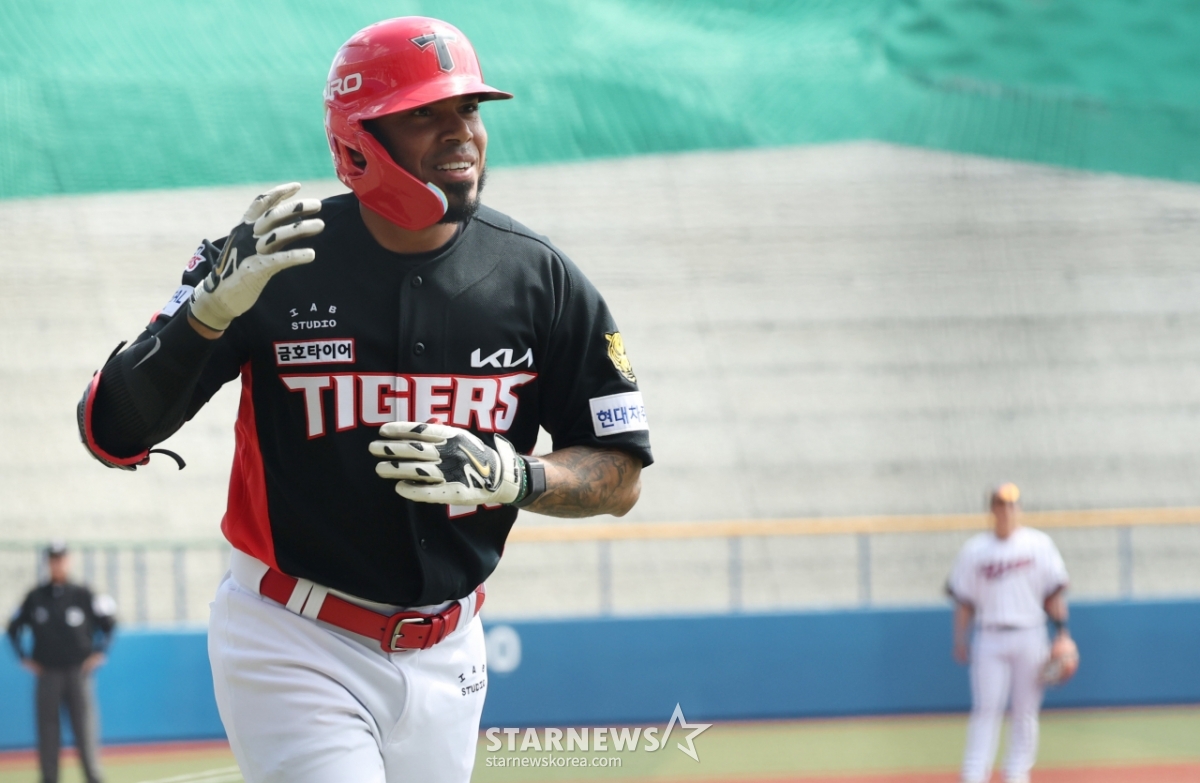 图为,起亚汽车队的卡斯特罗在第1回合初击出先发制人的优越2分本垒打后,正在回本垒打。