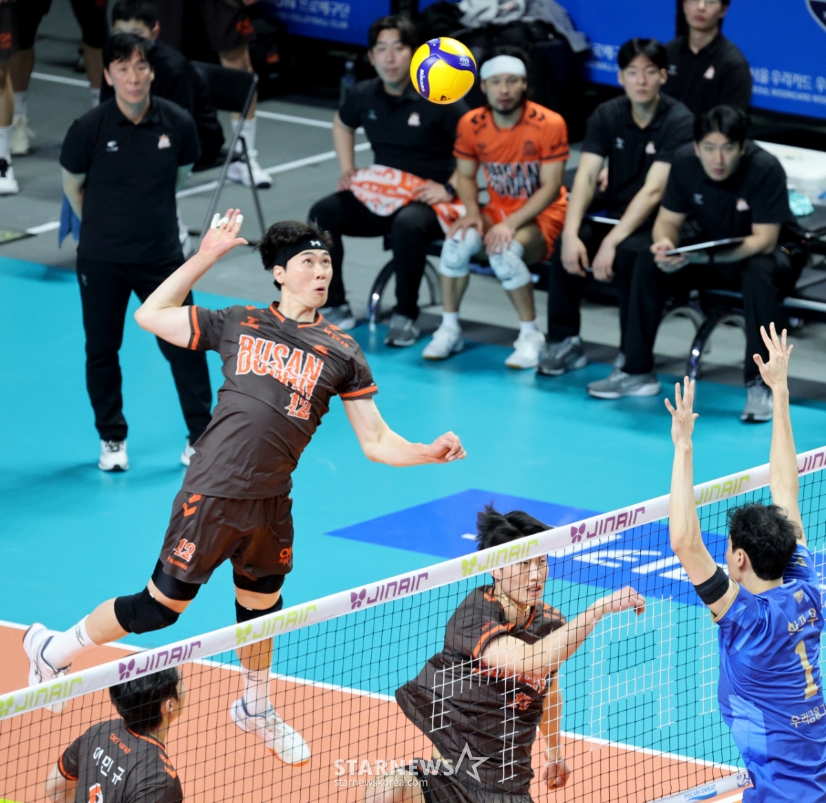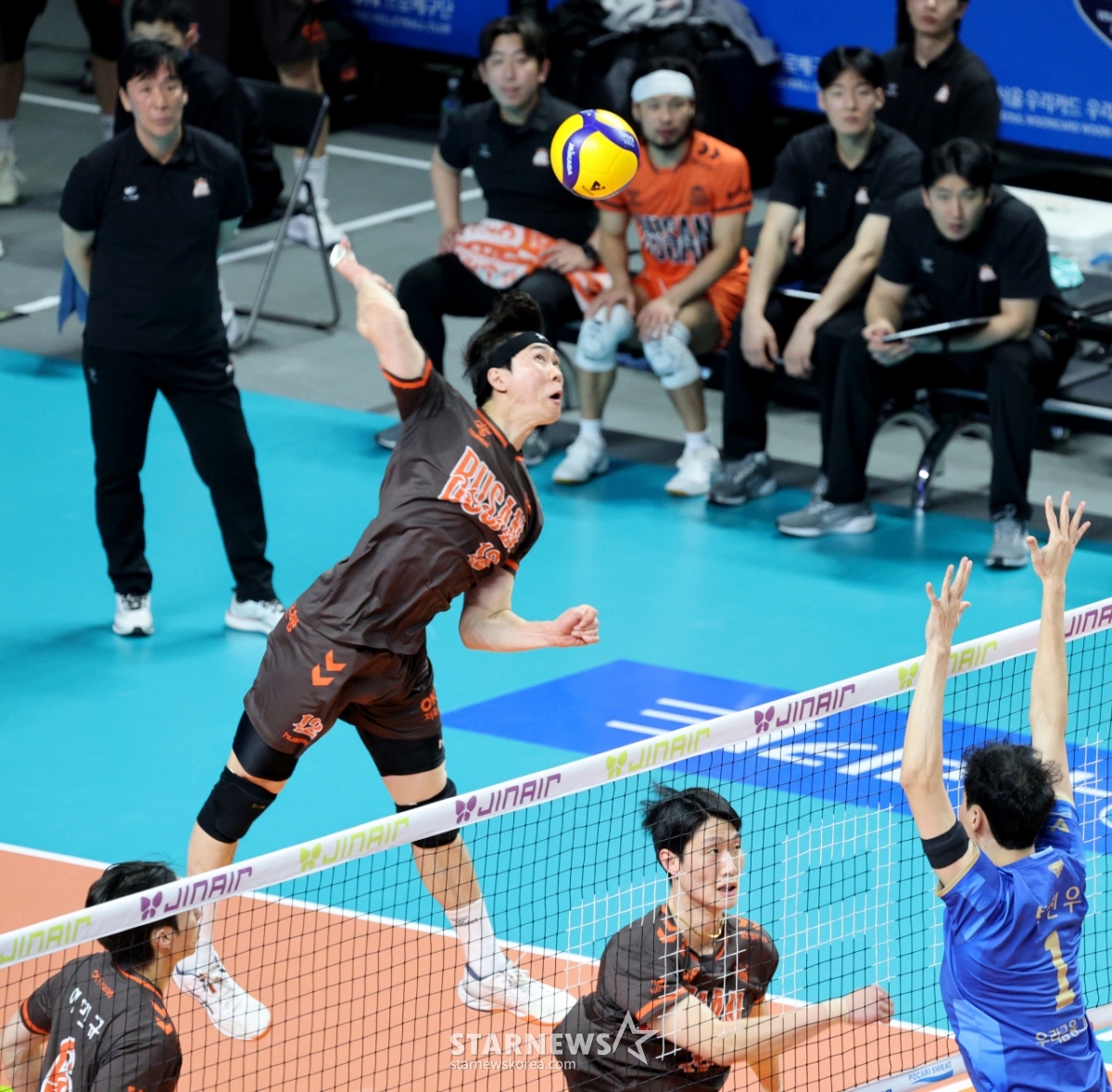 OK全光仁25日在奖忠体育馆举行的真航空2025-2026V联赛男子部友利卡和OK储蓄银行的比赛中,试图进行后排进攻。 2026.02.25.