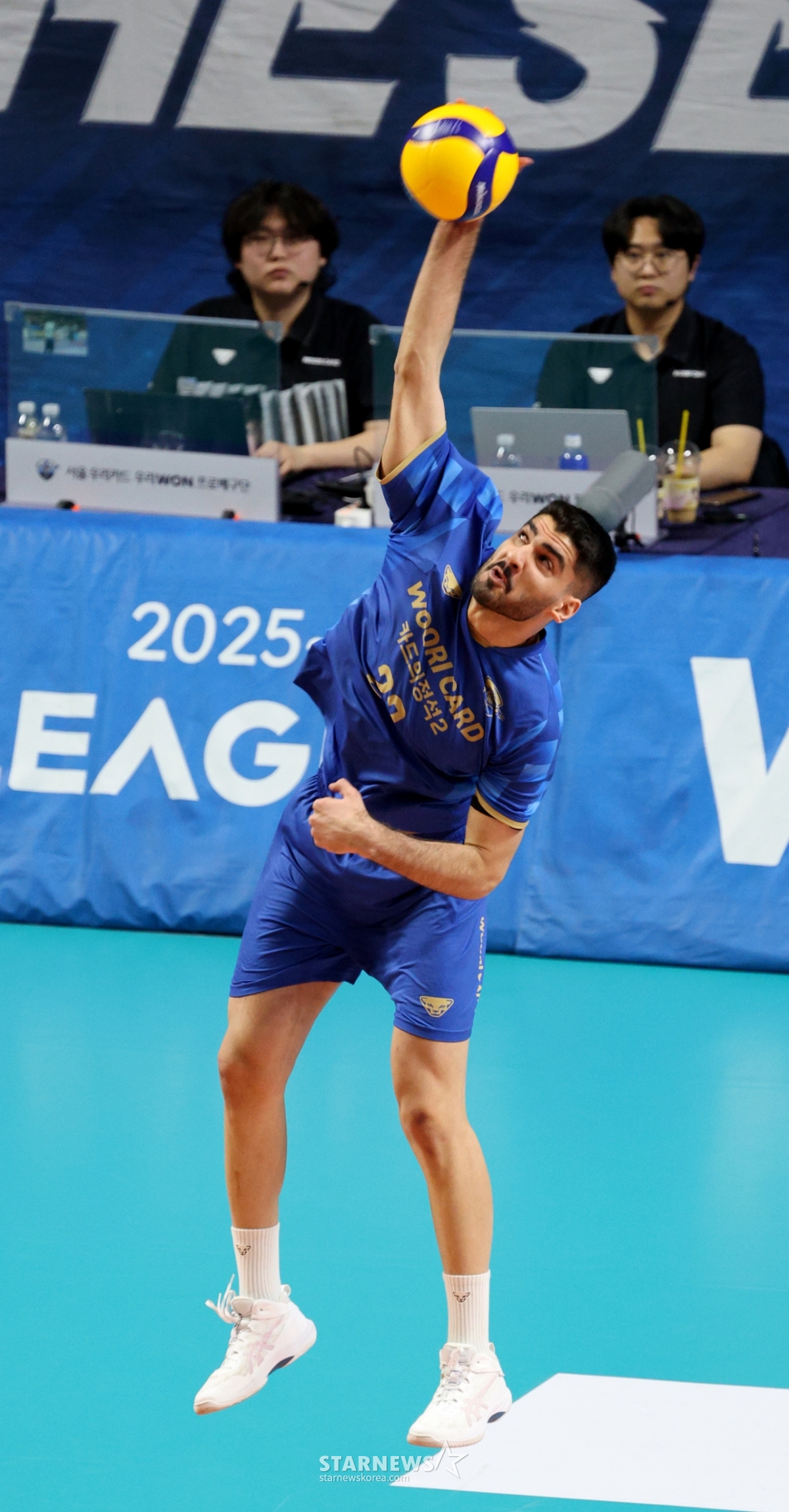 25日,友利阿里在奖忠体育馆举行的真航空2025-2026V联赛男子部友利信用卡和OK储蓄银行的比赛中,为了扣球发球正在飞翔。 2026.02.25.