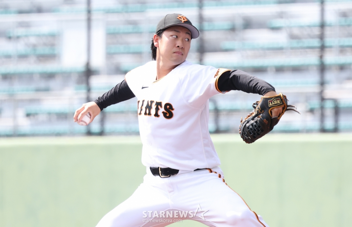 *此内容由AI翻译生成。28日,三星狮子队在日本冲绳县那霸球场与读卖巨人队进行了练习赛。读卖巨人队的尖子投手山崎衣织正在奋力投球。© STARNEWS. 未经许可禁止转载或再分发*此内容由AI翻译生成。