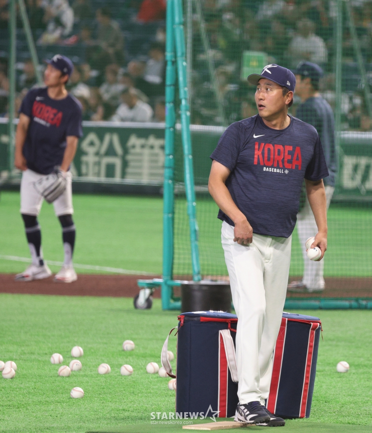 *此内容由AI翻译生成。7日,在东京巨蛋体育场举行的2026WBC东京POOL韩国队与日本队的比赛之前,棒球代表队教练崔元浩(音译)为进行外野手们的击球训练,正在投掷击球球。 2026.03.07.© STARNEWS. 未经许可禁止转载或再分发*此内容由AI翻译生成。