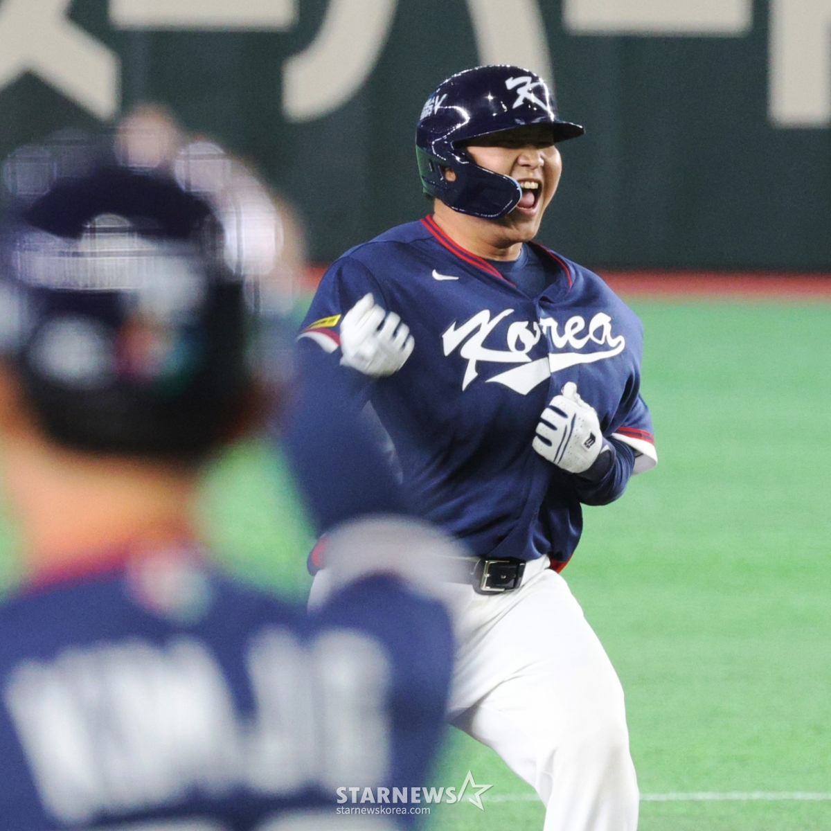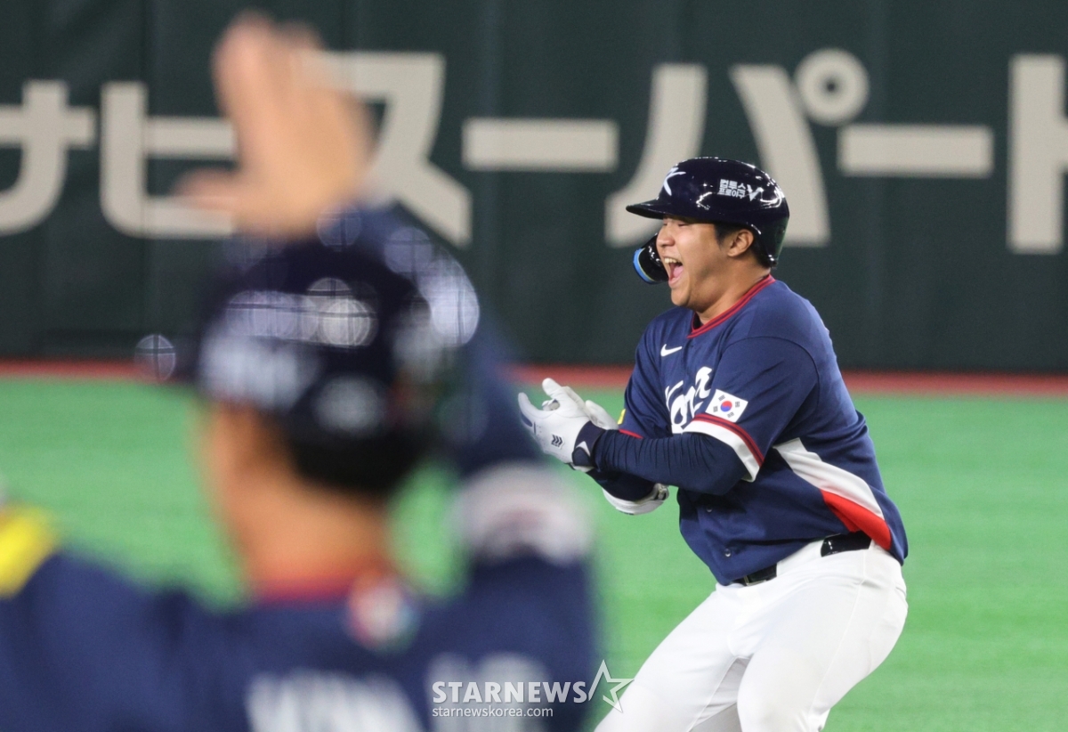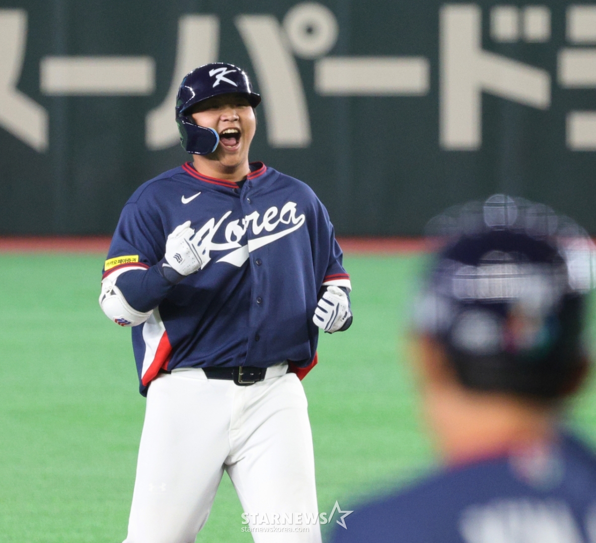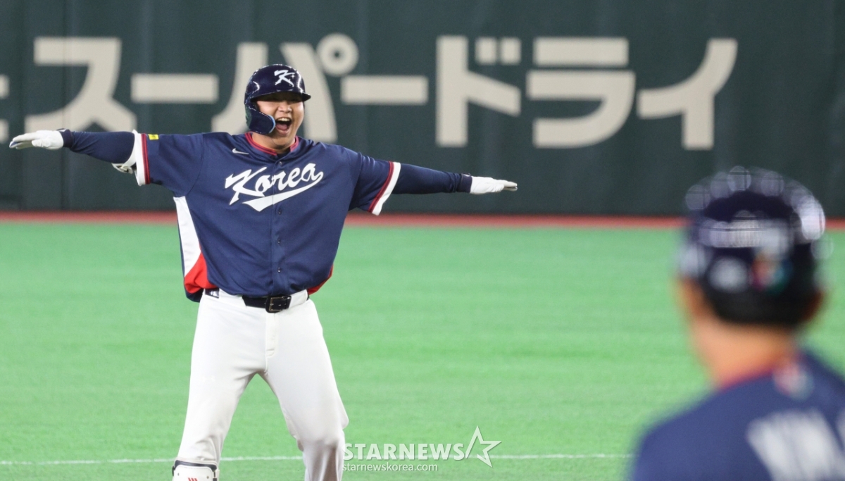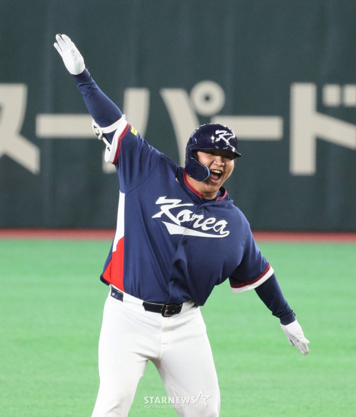 *此内容由AI翻译生成。7日,韩国6号击球手文宝京在东京巨蛋体育场举行的2026WBC东京POOL韩国队与日本队的比赛第1回合初,面对菊池幸男,在无2人出局1、2垒有人的情况下,击出2打点2垒打后,正在举行飞机庆祝仪式。 2026.03.05.© STARNEWS. 未经许可禁止转载或再分发*此内容由AI翻译生成。
