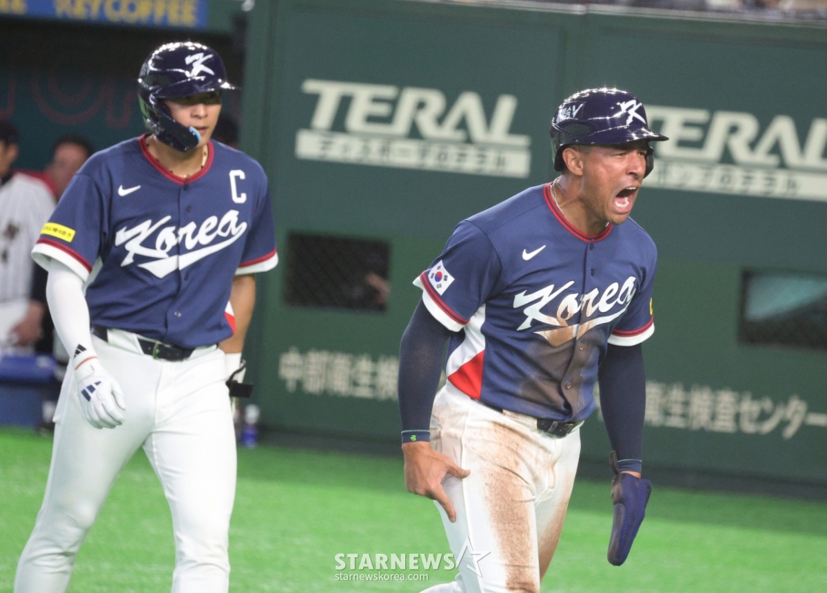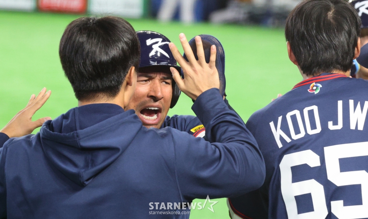 7日,韩国6号击球手文宝京在东京巨蛋体育场举行的2026WBC东京POOL韩国队与日本队的比赛第1回合初,面对菊池幸二,无2人出局1、2垒有人的情况下,击出了2打点2垒打。 得分的琼斯正在欢呼庆祝。 2026.03.05.