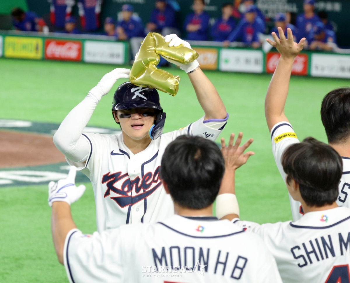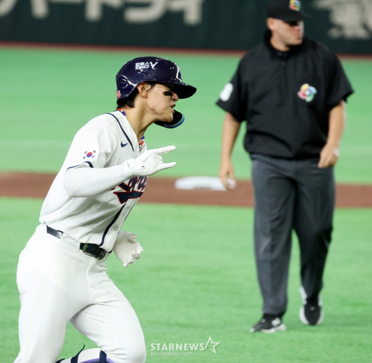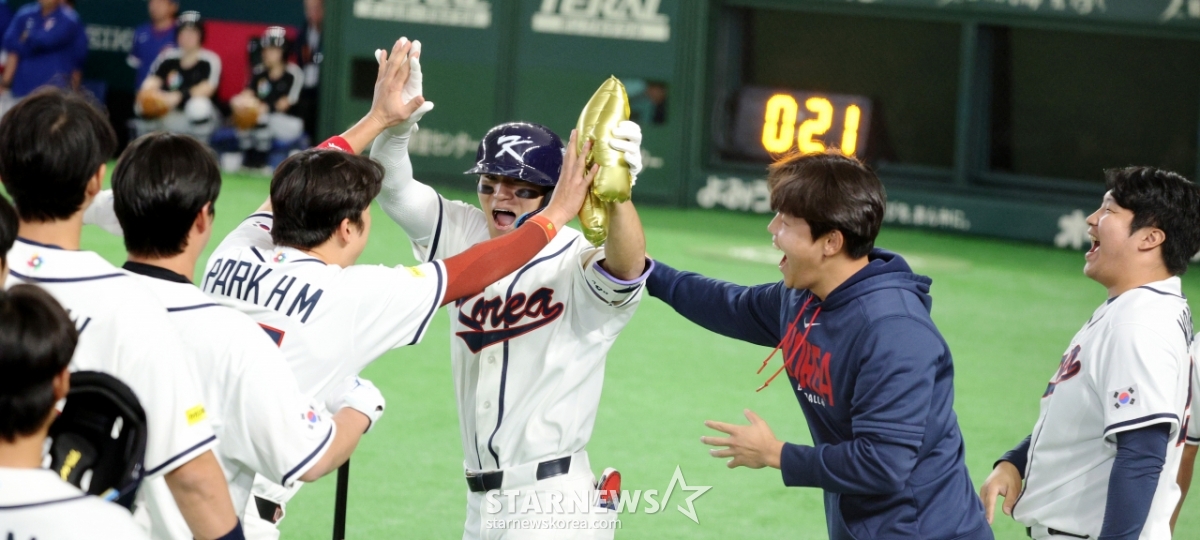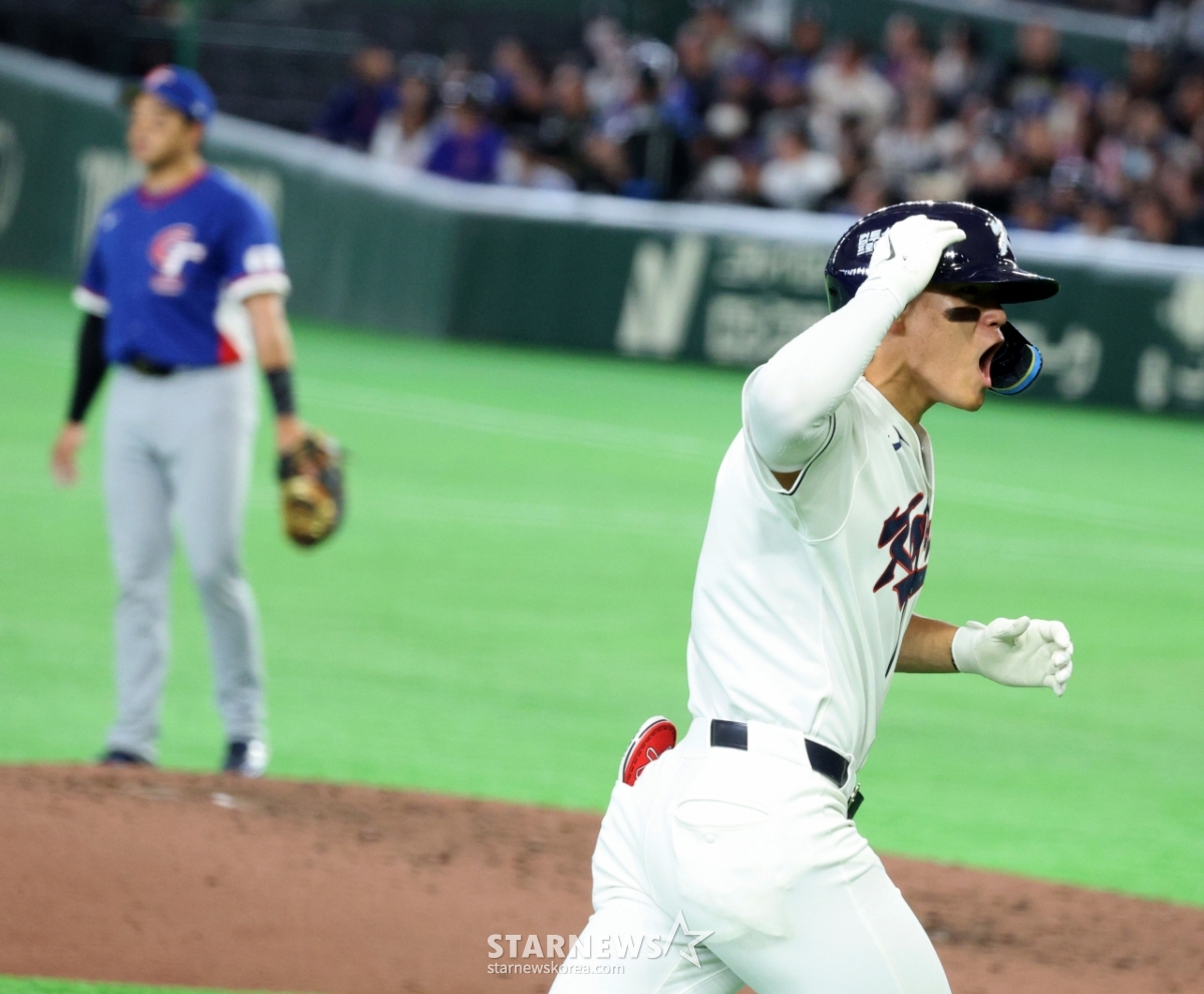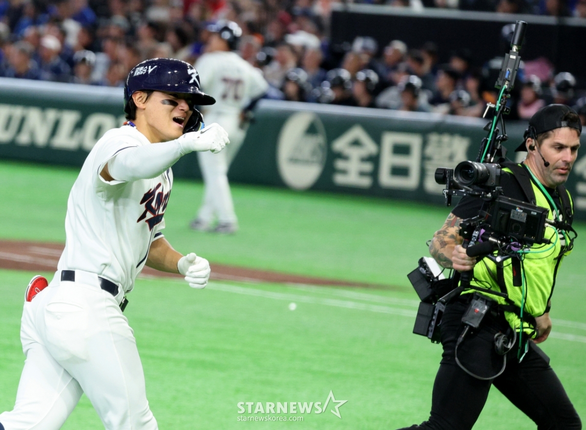 *此内容由AI翻译生成。8日,在东京巨蛋体育场举行的2026 WBC东京POOL韩国队与台湾队的比赛第6回合末,在1人出局1人在垒的情况下,韩国队1号击球手金道英击出逆转2分本垒打后,正在回本垒。 026.03.08.© STARNEWS. 未经许可禁止转载或再分发*此内容由AI翻译生成。