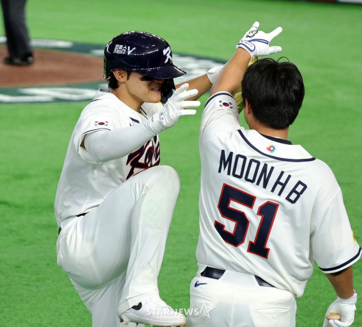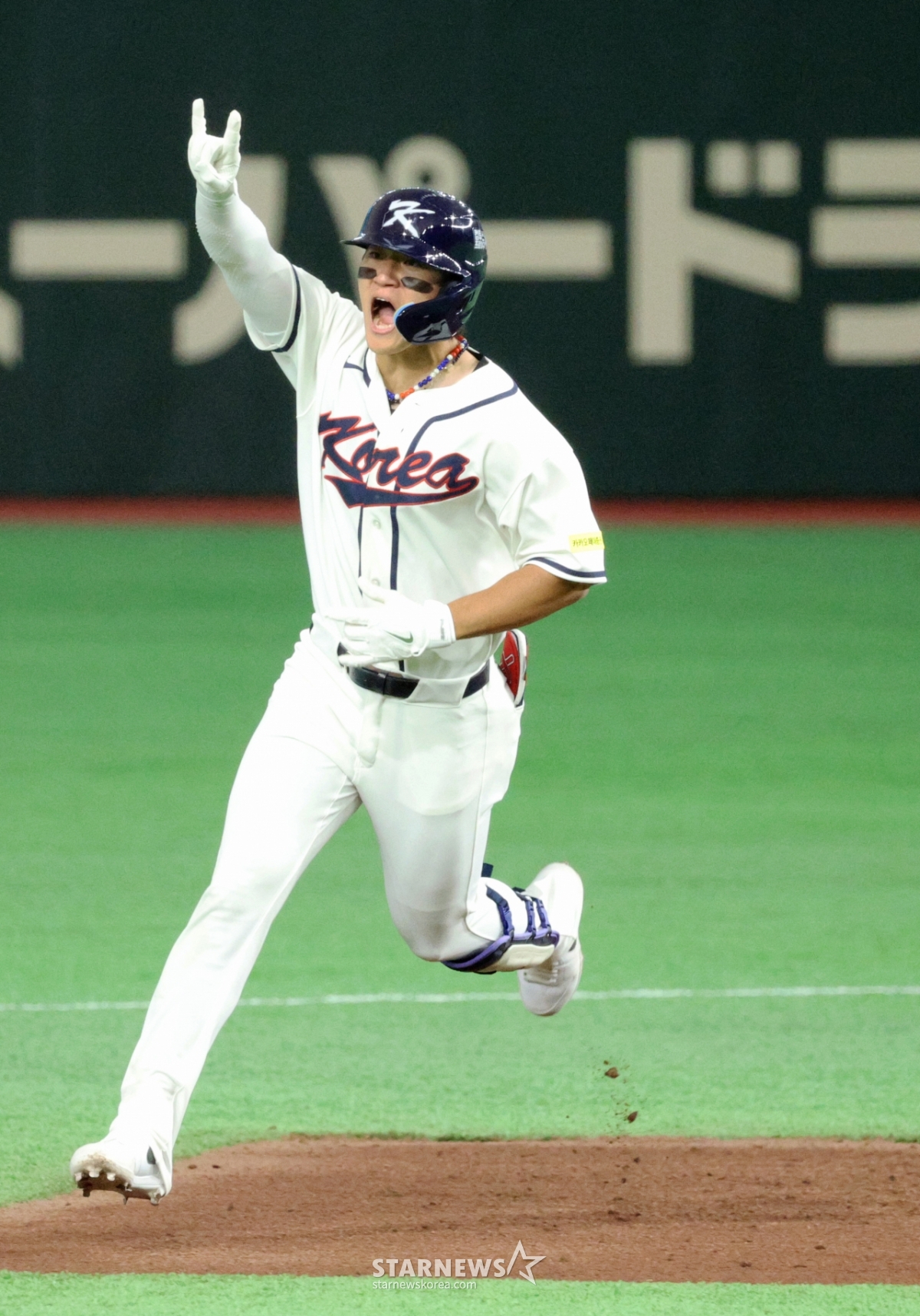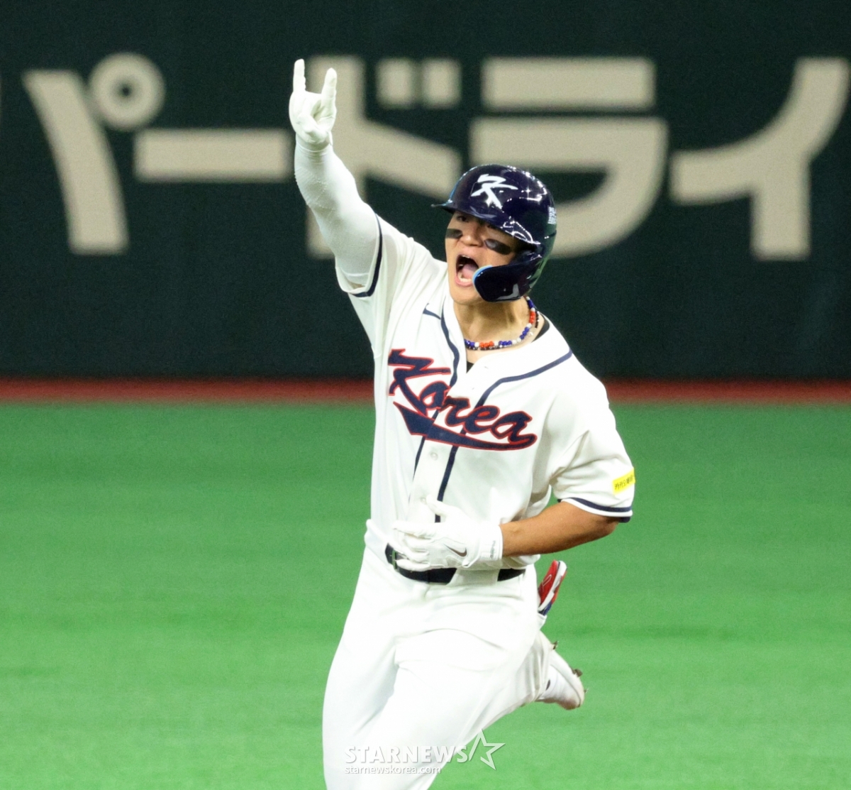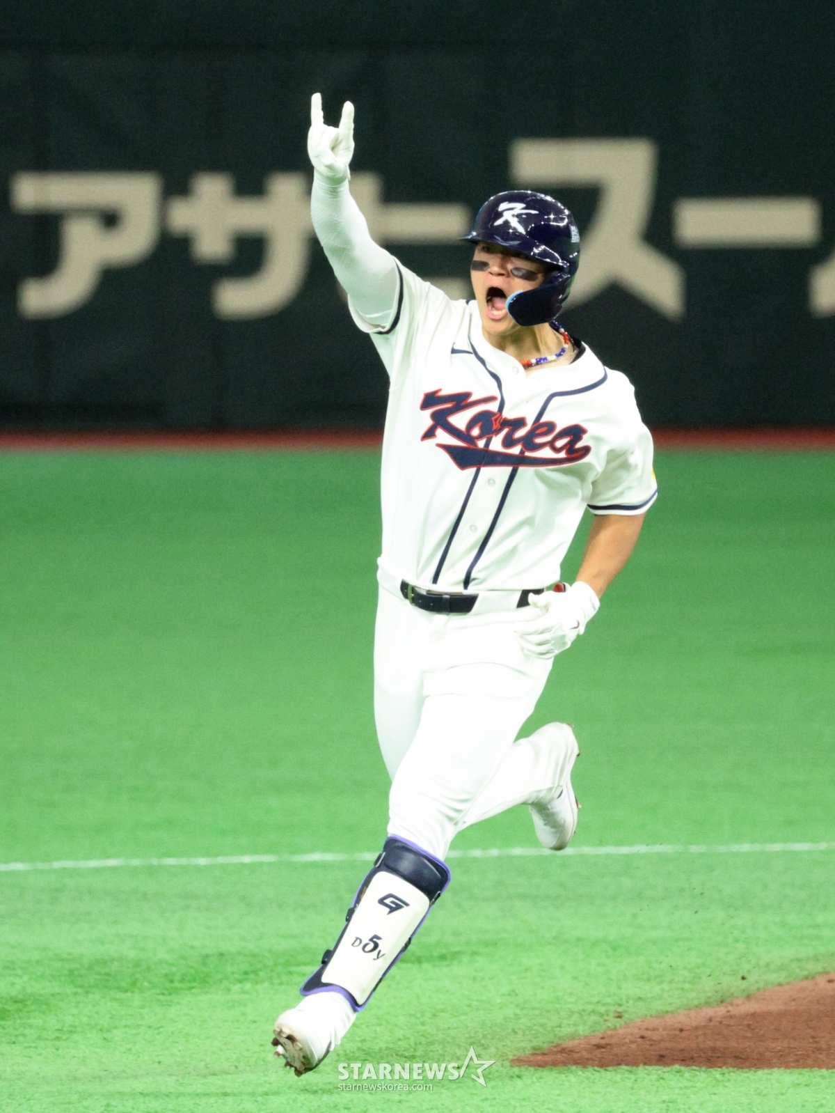*此内容由AI翻译生成。8日,在东京巨蛋体育场举行的2026 WBC东京POOL韩国队与台湾队的比赛第6回合末,在1人出局1人在垒的情况下,韩国队1号击球手金道英击出逆转2分本垒打后,正在回本垒。 026.03.08.© STARNEWS. 未经许可禁止转载或再分发*此内容由AI翻译生成。