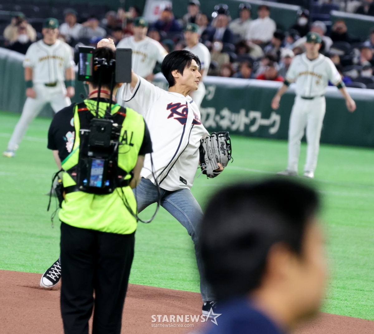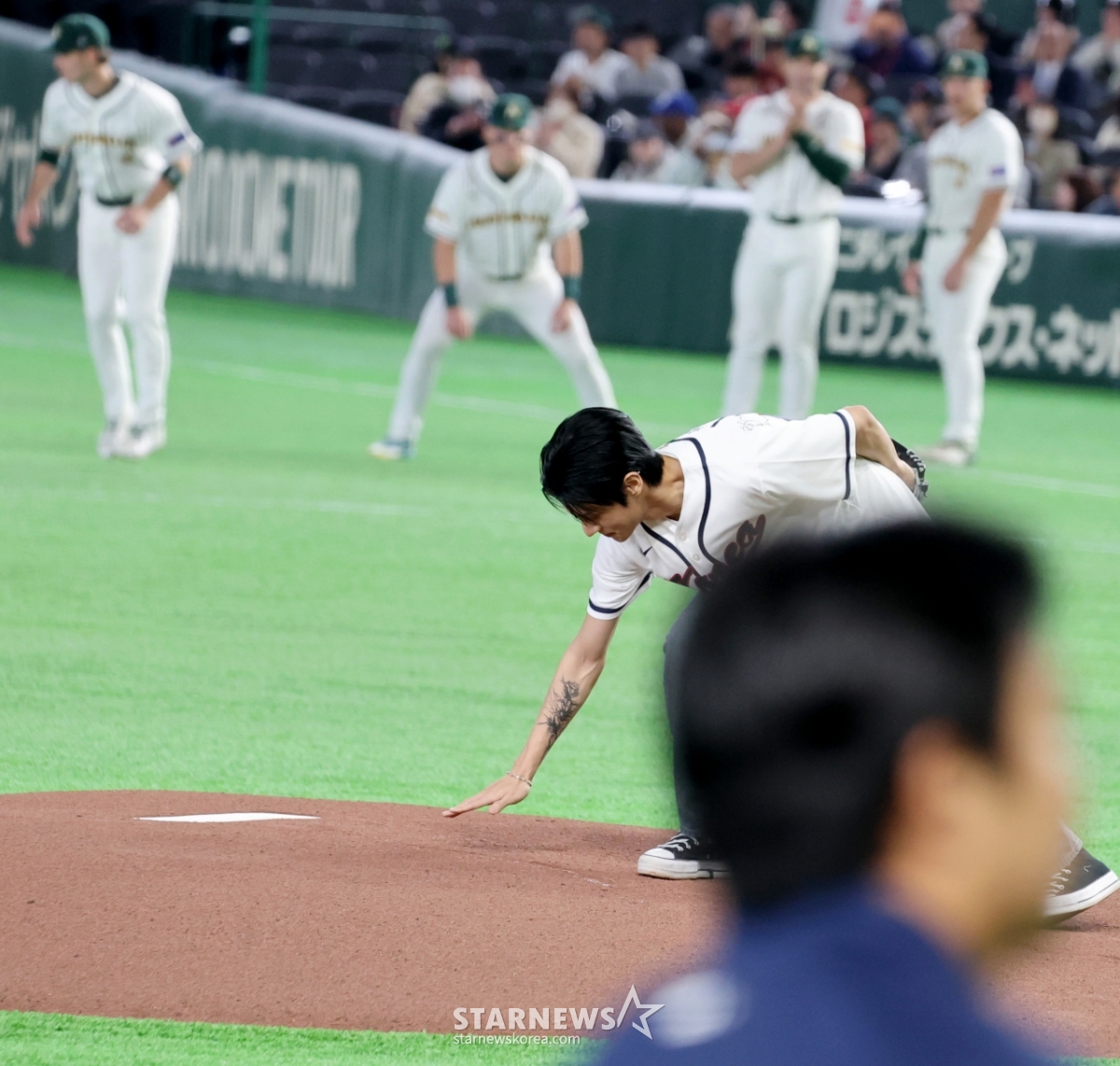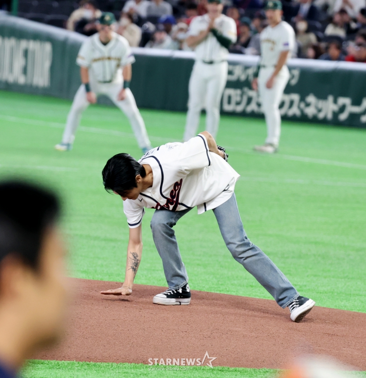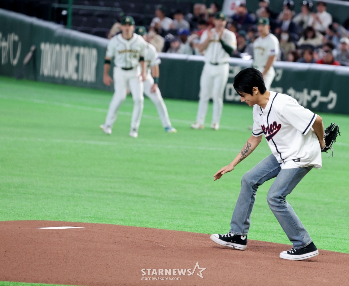 *此内容由AI翻译生成。9日,ATEEZ佑荣在东京巨蛋体育场举行的2026 WBC东京POOL大韩民国队与澳大利亚队的比赛中开球。 图为结束开球的佑荣退场后再次回到投手踏板,做出惊人的动作。 空手面对被自己踩得乱七八糟的踏板时,金妍儿表现出了良好的风度。 026.03.08.© STARNEWS. 未经许可禁止转载或再分发*此内容由AI翻译生成。
