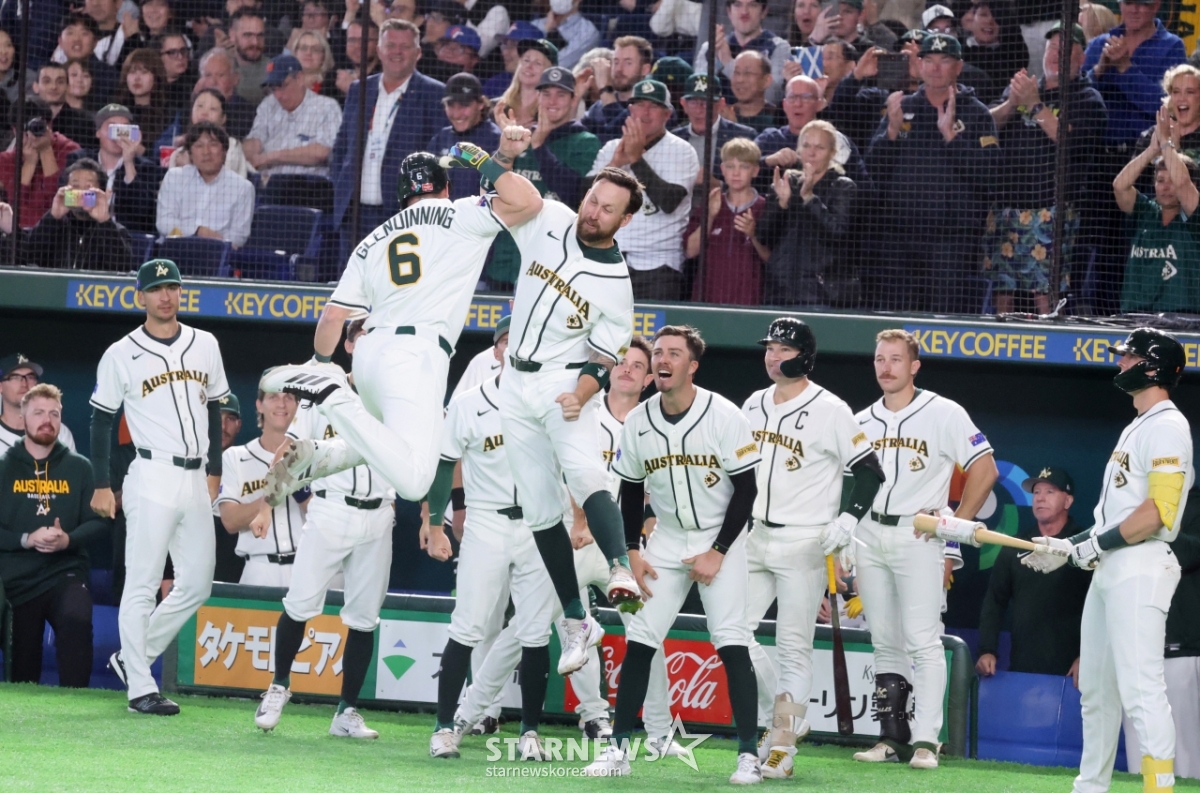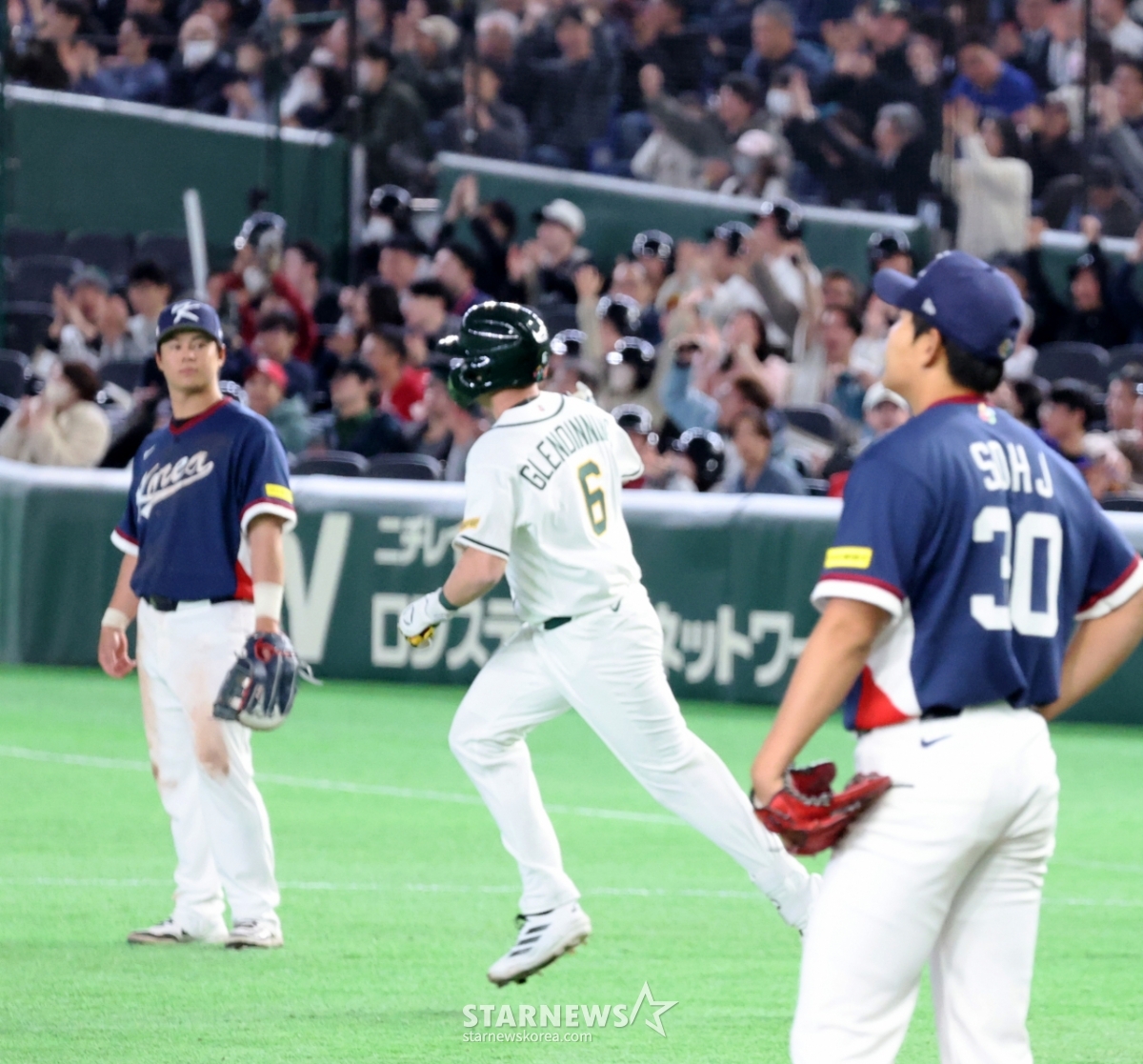 *此内容由AI翻译生成。9日,澳大利亚6号击球手格伦迪宁在东京巨蛋体育场举行的2026 WBC东京POOL大韩民国队与澳大利亚队的比赛第5回合末作为首发击球手出场,面对苏亨俊击出追击单垒打后,正在回本垒。 澳大利亚队以5比1紧追不舍,比分是026.03.08。© STARNEWS. 未经许可禁止转载或再分发*此内容由AI翻译生成。