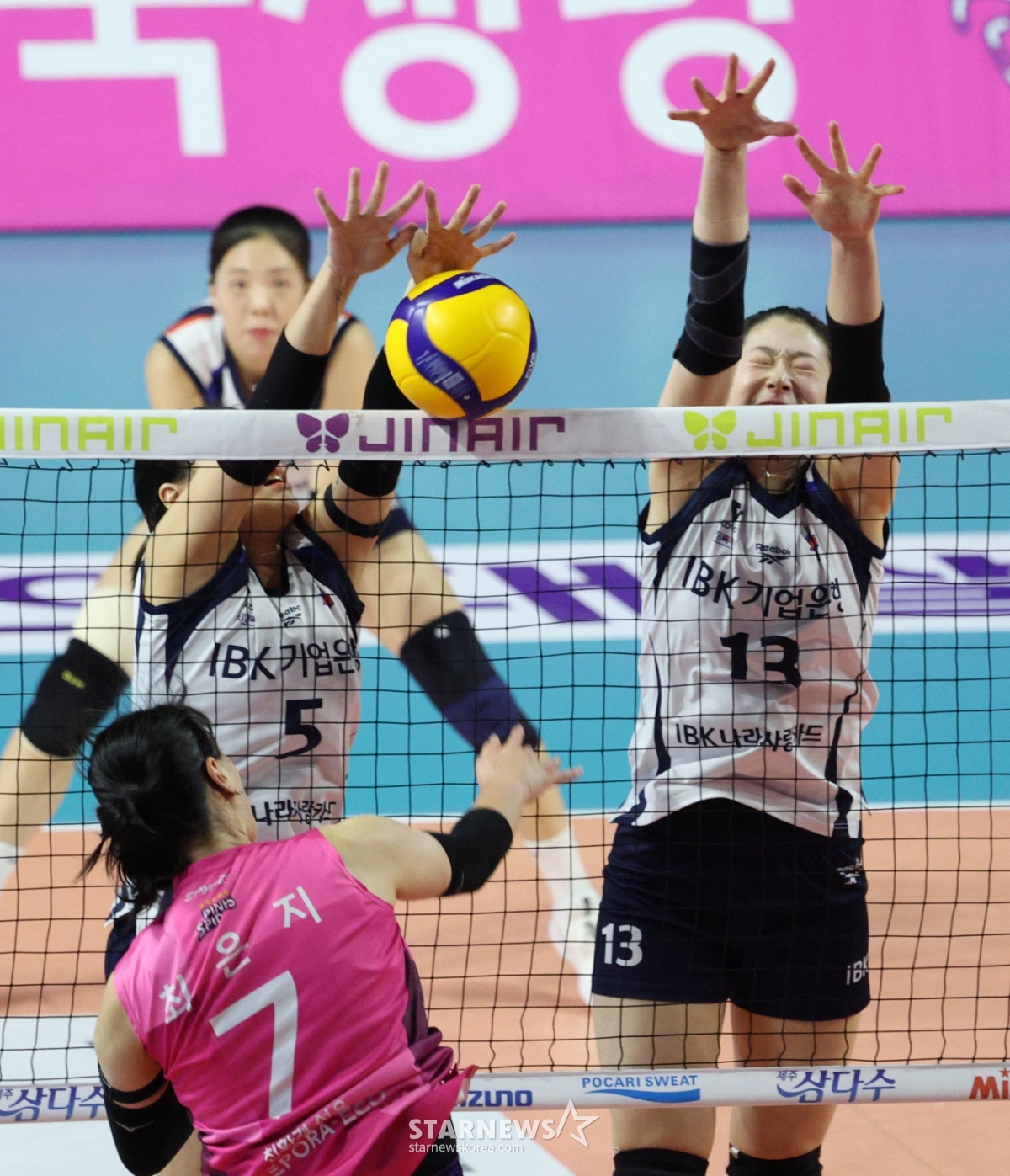 *此内容由AI翻译生成。10日,2025-2026 V联赛女子部兴国生命对IBK企业银行的比赛在仁川三山世界体育馆举行。IBK企业银行金夏景和崔正民正在拦网兴国生命崔恩智的扣球。© STARNEWS. 未经许可禁止转载或再分发*此内容由AI翻译生成。