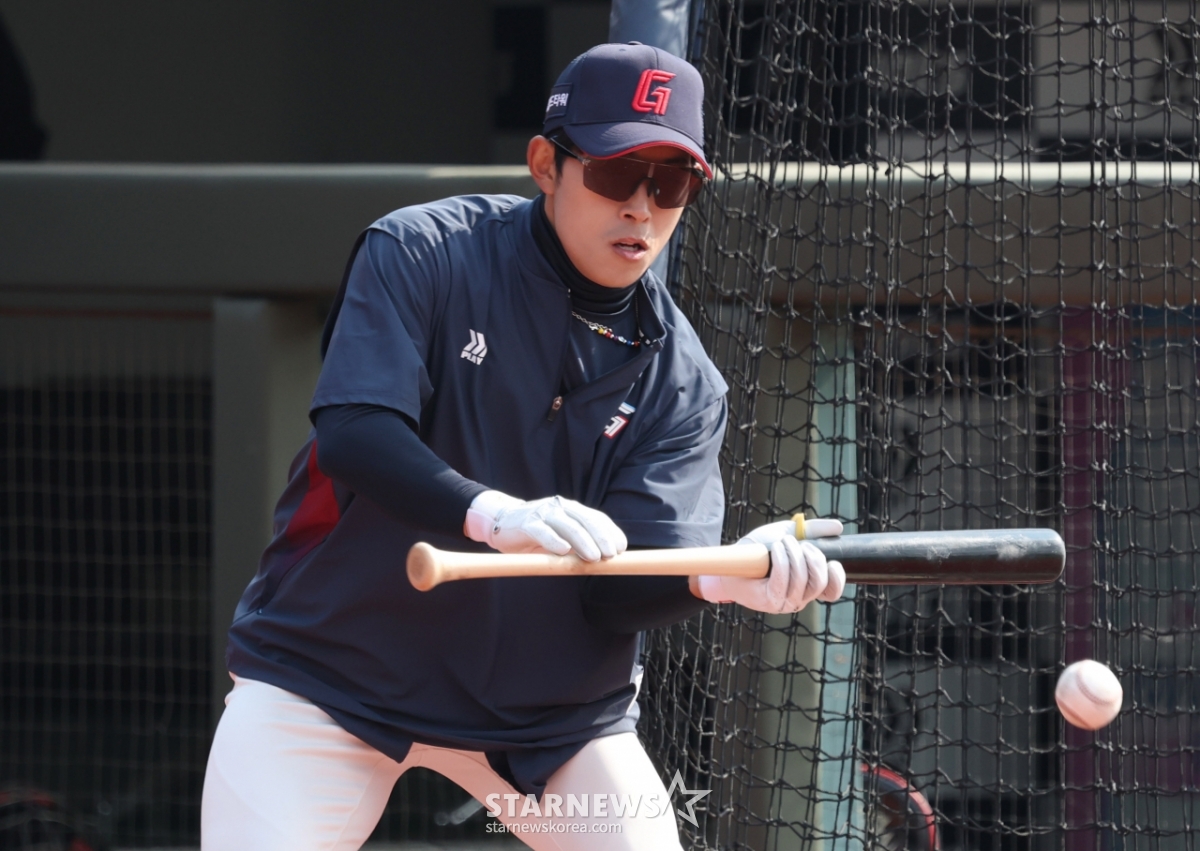 *此内容由AI翻译生成。12日,2026新韩SOL Bank KBO联赛示范赛乐天巨人队对KT WIZ的比赛在釜山社稷棒球场举行。图为乐天队的黄成彬(音)正在进行触击训练。© STARNEWS. 未经许可禁止转载或再分发*此内容由AI翻译生成。