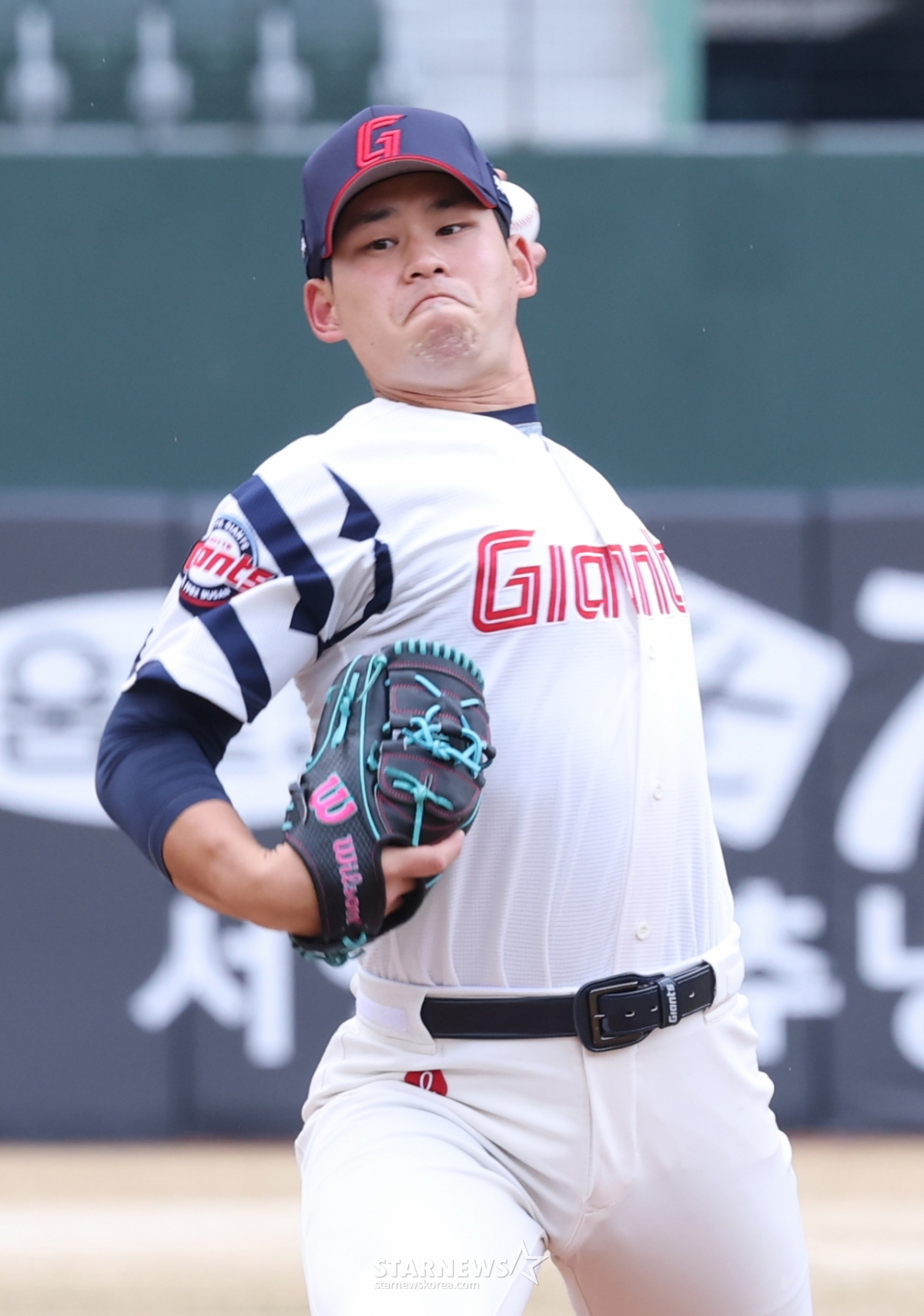 乐天队的首发投手金镇旭正在奋力拼搏。