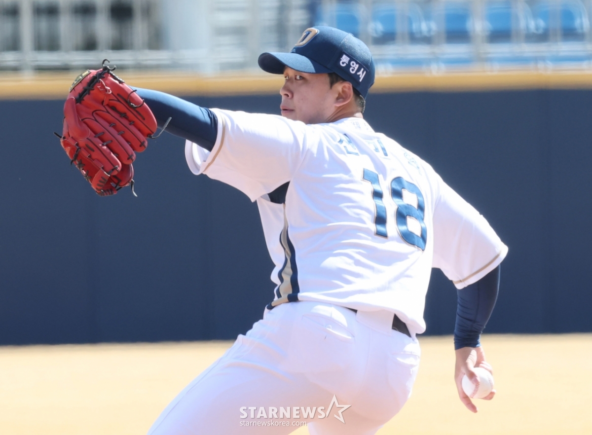 *此内容由AI翻译生成。13日,2026新韩SOL Bank KBO联赛表演赛NC Dinos对LG Twins的比赛在庆南昌原市马山棒球场举行。NC队的首发投手申敏赫正在奋力拼搏。© STARNEWS. 未经许可禁止转载或再分发*此内容由AI翻译生成。