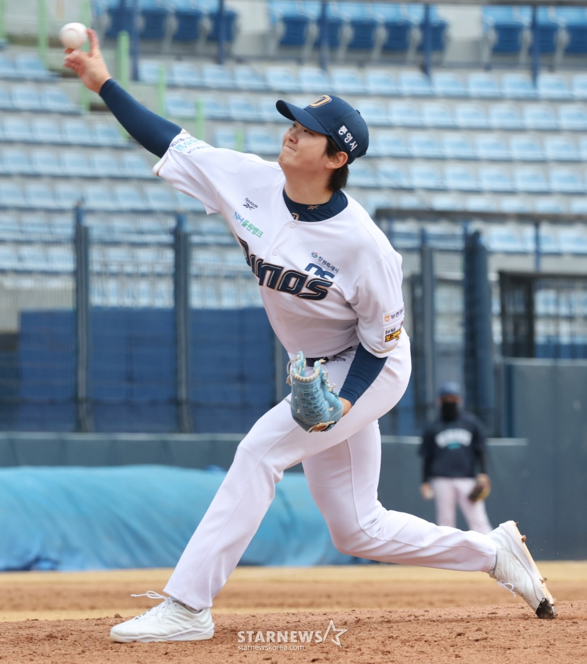 *此内容由AI翻译生成。13日,2026新韩SOL Bank KBO联赛表演赛NC Dinos对LG Twins的比赛在庆南昌原市马山棒球场举行。图为NC队的詹士民正在奋力投球。© STARNEWS. 未经许可禁止转载或再分发*此内容由AI翻译生成。