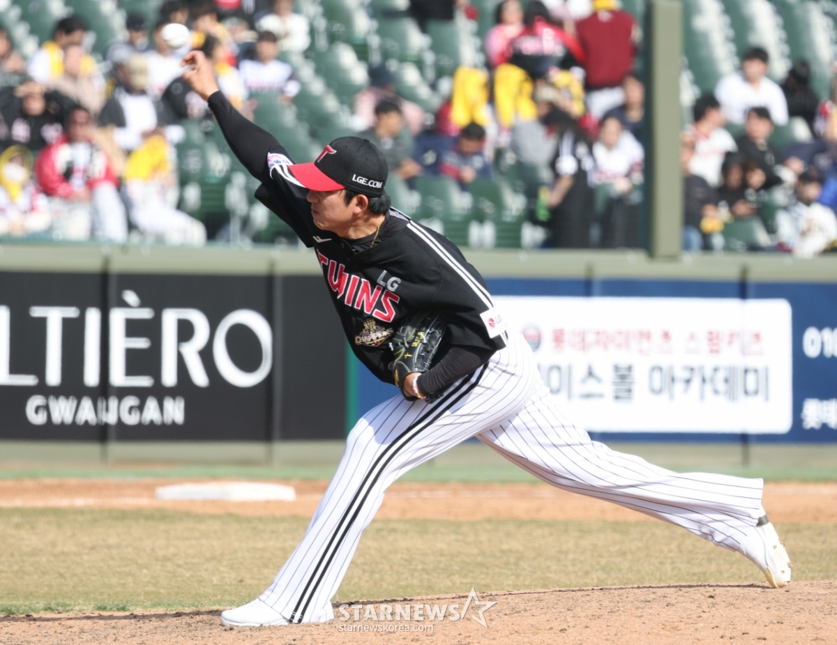 LG队的张时焕正在奋力投球。