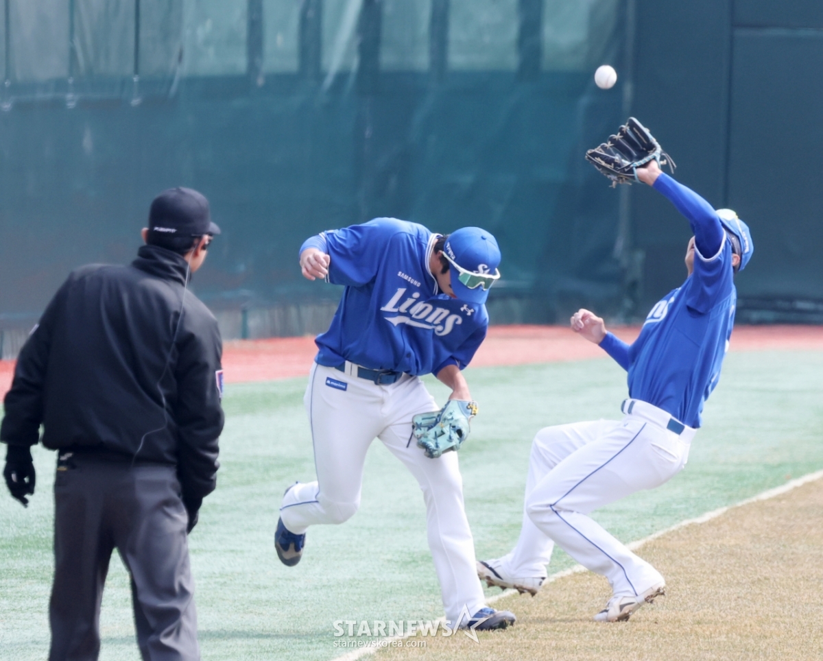 16日,在仁川SSG兰德斯球场举行的2026职业棒球表演赛SSG兰德斯队与三星狮子队比赛第1回合末,三星游击手李在贤正在捕捉SSG队1号击球手崔志勋的内野飞球。 2026.03.16