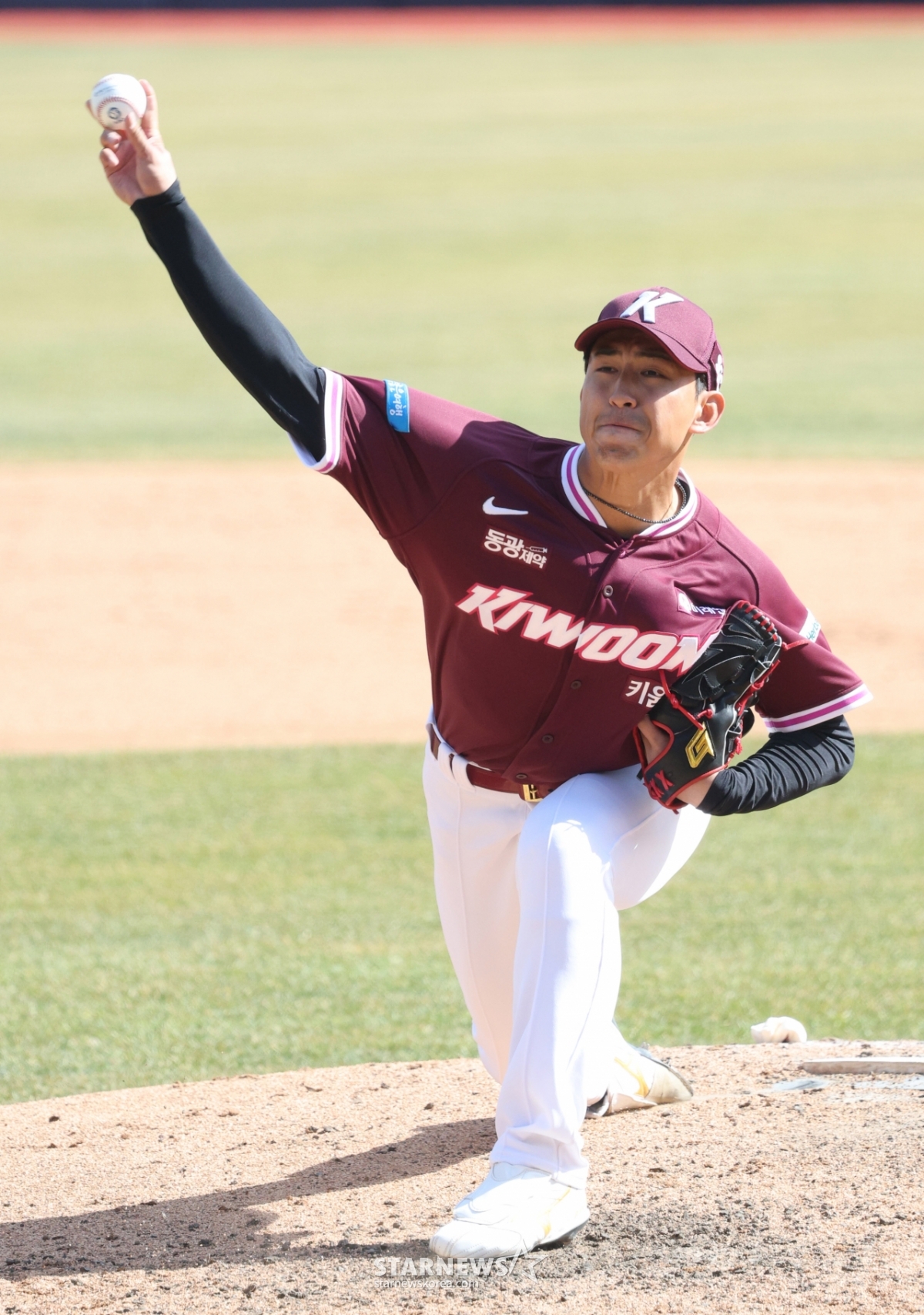 Kiwoom队的Yuto正在奋力投球。