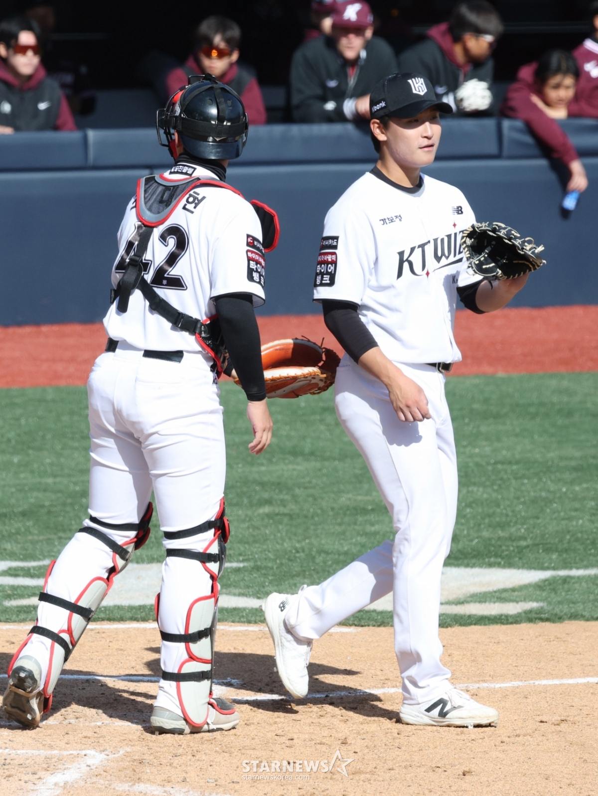 *此内容由AI翻译生成。19日,2026新韩SOL Bank KBO联赛表演赛KT WIZ对KIWOOM HEROZ的比赛在水原KT WIZ PARK举行。KT队的朴志训被对方击出连续安打后,接球手曹大铉正在稳定局面。© STARNEWS. 未经许可禁止转载或再分发*此内容由AI翻译生成。
