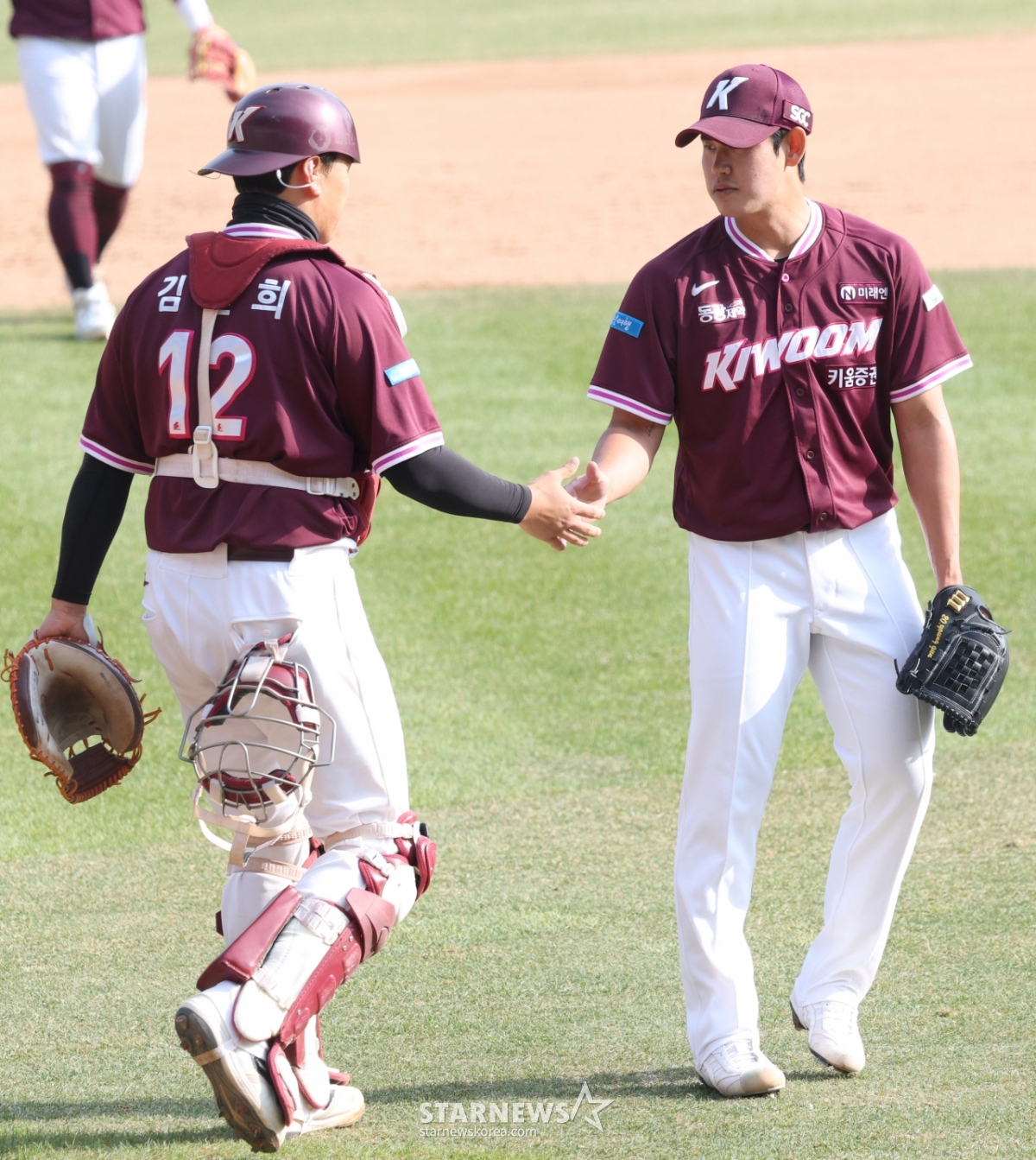 *此内容由AI翻译生成。23日,2026新韩SOL Bank KBO联赛表演赛LG Twins对Kiwoom Heroes的比赛在首尔蚕室棒球场举行。图为,Kiwoom赵容健(音)在比赛结束后,正与接球手金建熙(音)分享喜悦。© STARNEWS. 未经许可禁止转载或再分发*此内容由AI翻译生成。
