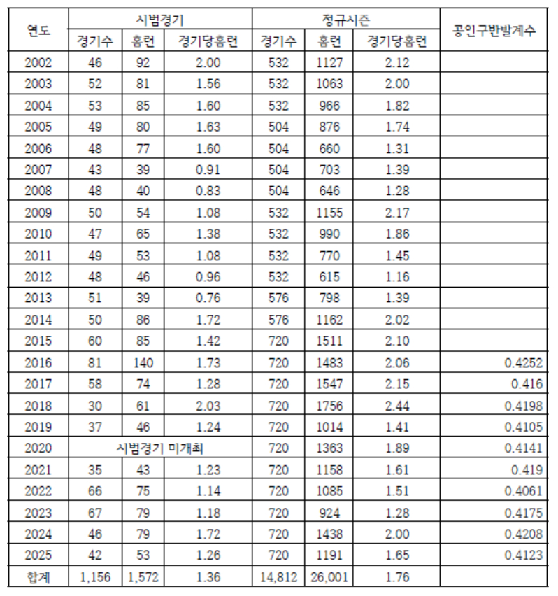 从这张表上可以清楚地看出几种趋势。 从2002年到2025年,季前赛和正规赛季的每场比赛平均本垒打分别为1.36个和1.76个。 季前赛每场比赛本垒打较高的赛季,在常规赛上本垒打也呈现出增加的趋势。 2014年、2016年、2018年、2024年就是代表性的事例。 相反,在季前赛本垒打较低的赛季(2007~2008年、2012~2013年、2022~2023年),在常规赛中也出现了长打生产减少的趋势。
