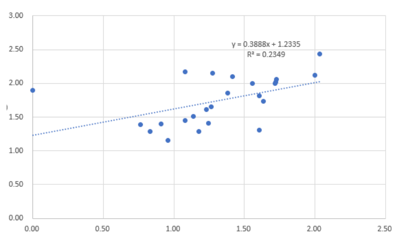 为了定量确认这一点,对2002年至2025年的24年间季前赛和常规赛每场比赛的本垒打进行回归分析的结果显示,两个指标之间存在正(+)的相关关系。 回归方程如下。 y = 0.3888x + 1.2335 (R² = 0.2349)(x是季前赛每场本垒打,y是常规赛每场本垒打)