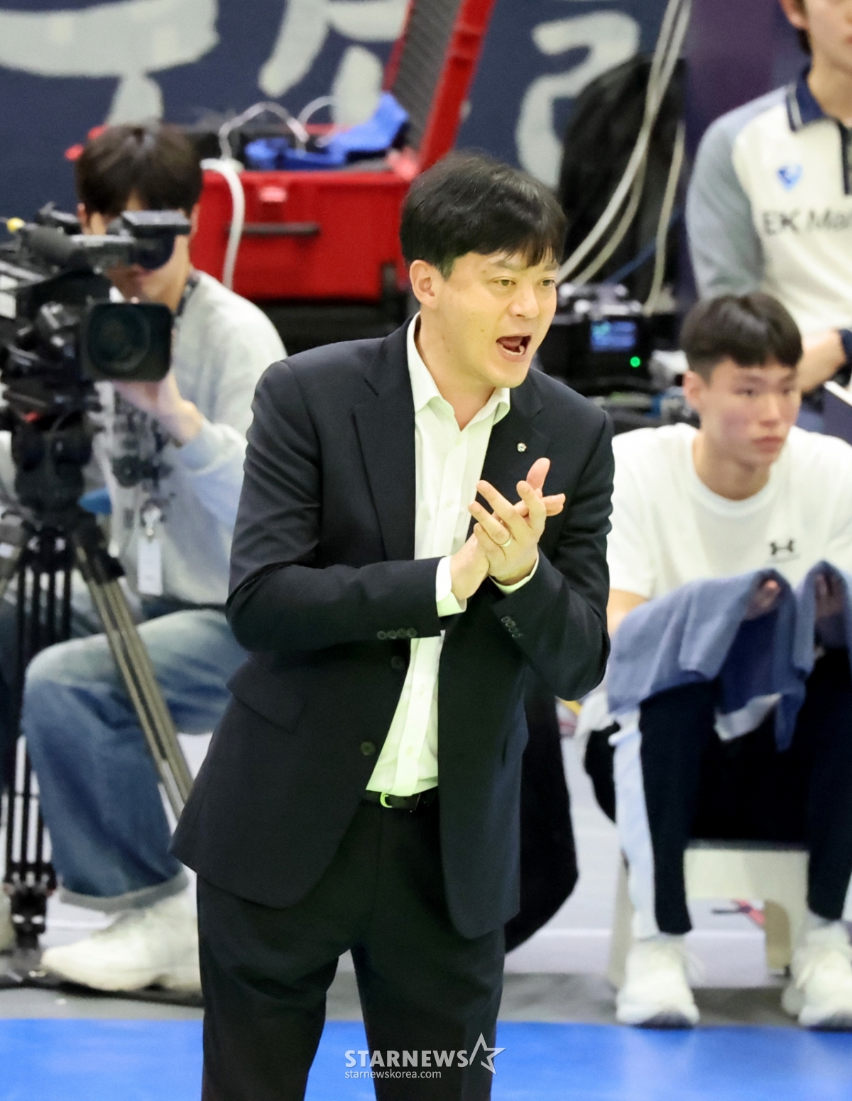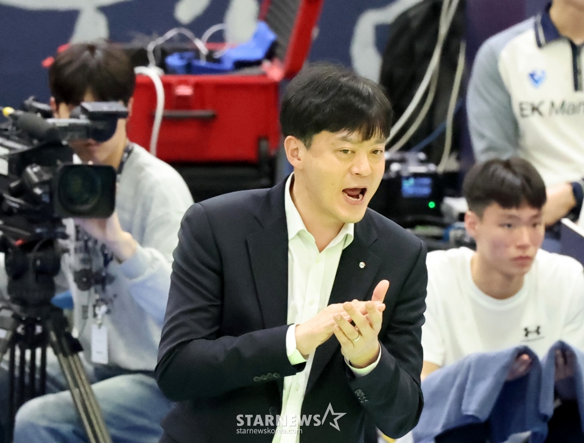 *此内容由AI翻译生成。26日,在水原体育馆举行的2025-2026真航空V联赛现代建设队和GS凯尔特克斯队季后赛上,主教练李永泽正在鼓励选手们。 .2026.03.26.© STARNEWS. 未经许可禁止转载或再分发*此内容由AI翻译生成。