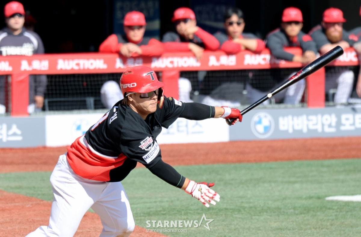 *此内容由AI翻译生成。起亚5号击球手金善彬28日在仁川SSG兰德斯球场举行的2026职业棒球SSG兰德斯队和起亚老虎队开幕赛第5回合初无人出局满垒的情况下,以2打点安打出垒。 2026.03.28.© STARNEWS. 未经许可禁止转载或再分发*此内容由AI翻译生成。