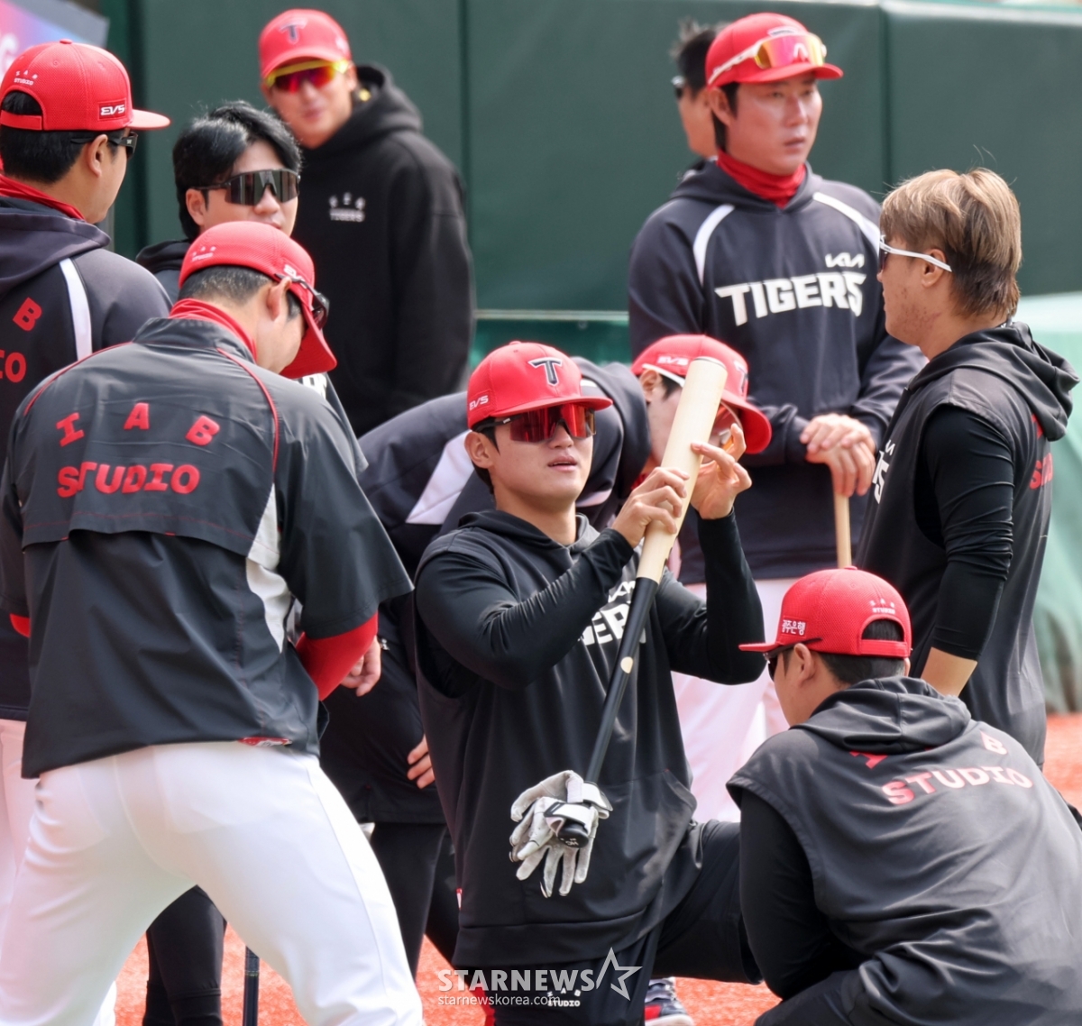 *此内容由AI翻译生成。29日,起亚队内野手金道英在仁川SSG兰德斯球场举行的2026职业棒球SSG兰德斯队和起亚老虎队的比赛前夕,正在热身时听到球棒发出的共鸣声。 2026.03.29.© STARNEWS. 未经许可禁止转载或再分发*此内容由AI翻译生成。