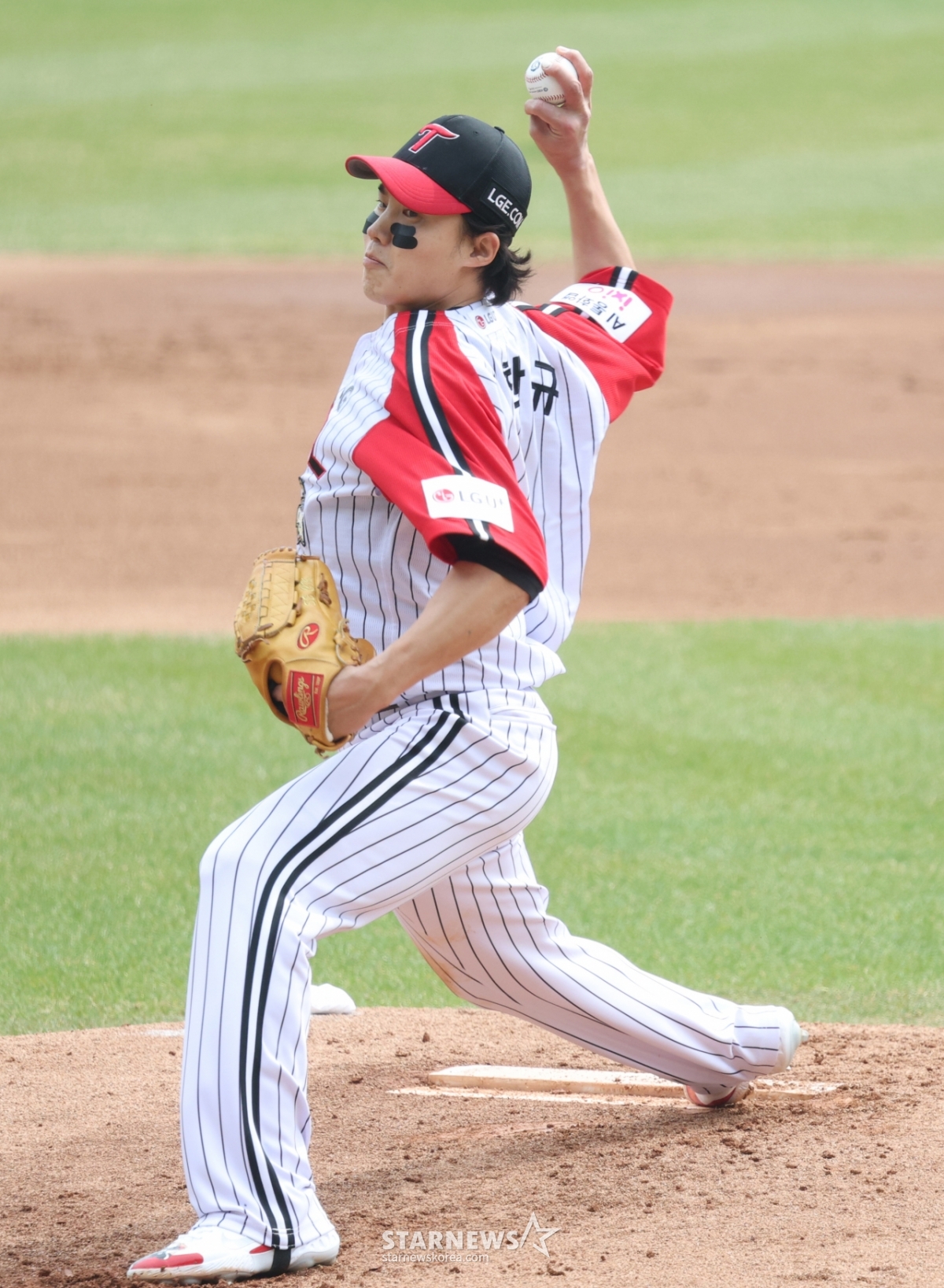 *此内容由AI翻译生成。29日,2026新韩SOL Bank KBO联赛LG双子对KT WIZ的比赛在首尔蚕室棒球场举行。LG队的首发投手林灿圭正在奋力拼搏。© STARNEWS. 未经许可禁止转载或再分发*此内容由AI翻译生成。