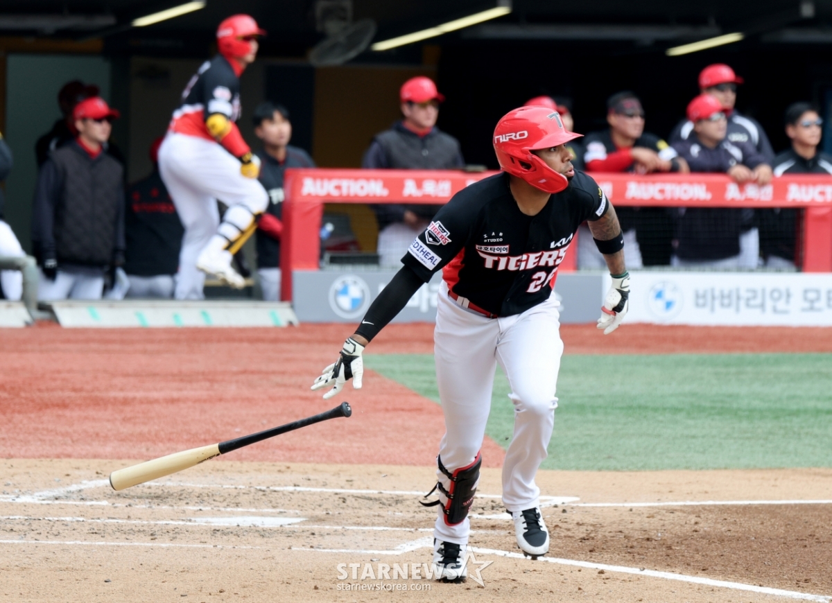 *此内容由AI翻译生成。29日,在仁川SSG兰德斯球场举行的2026职业棒球SSG兰德斯队与起亚虎队的比赛第3回合初,起亚队2号击球手卡斯特罗在1人出局1、2垒有人的情况下,以安打出垒。 2026.03.29.© STARNEWS. 未经许可禁止转载或再分发*此内容由AI翻译生成。