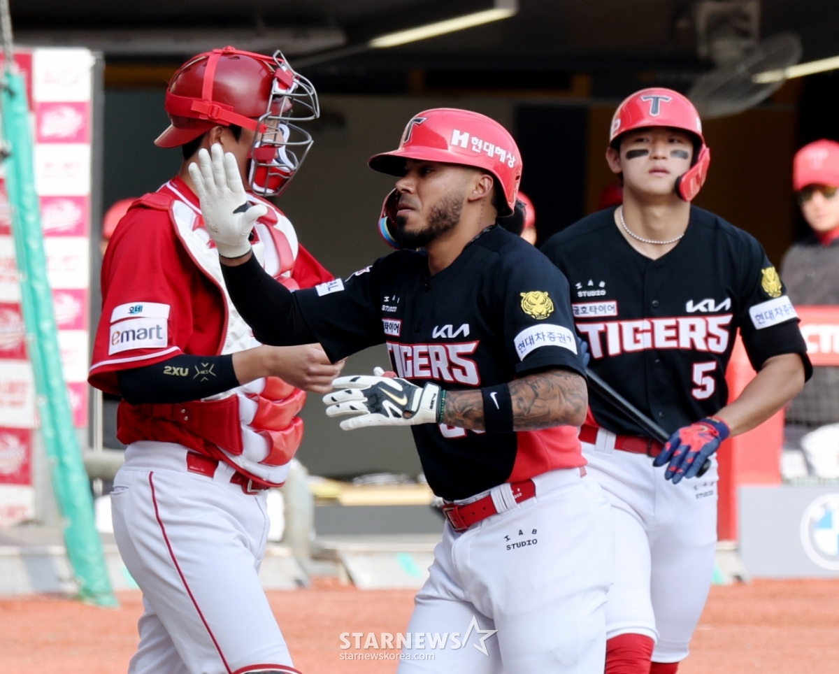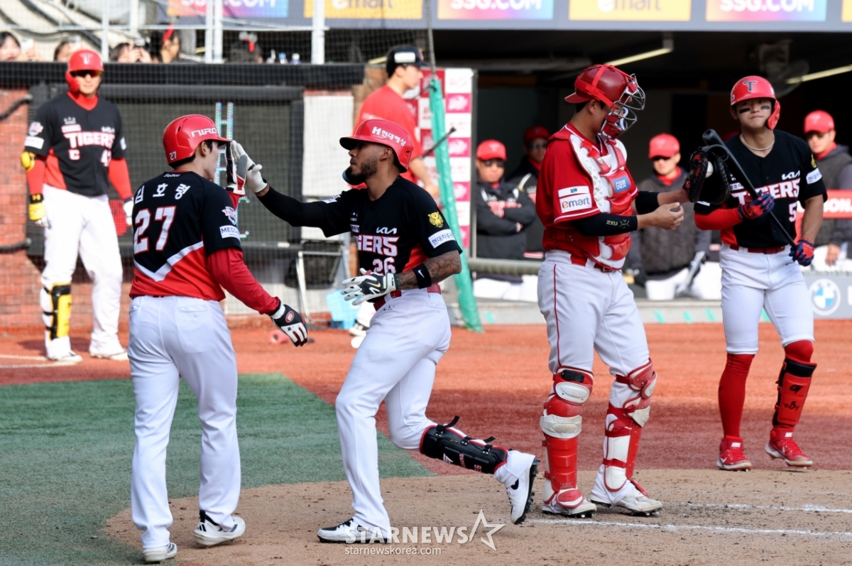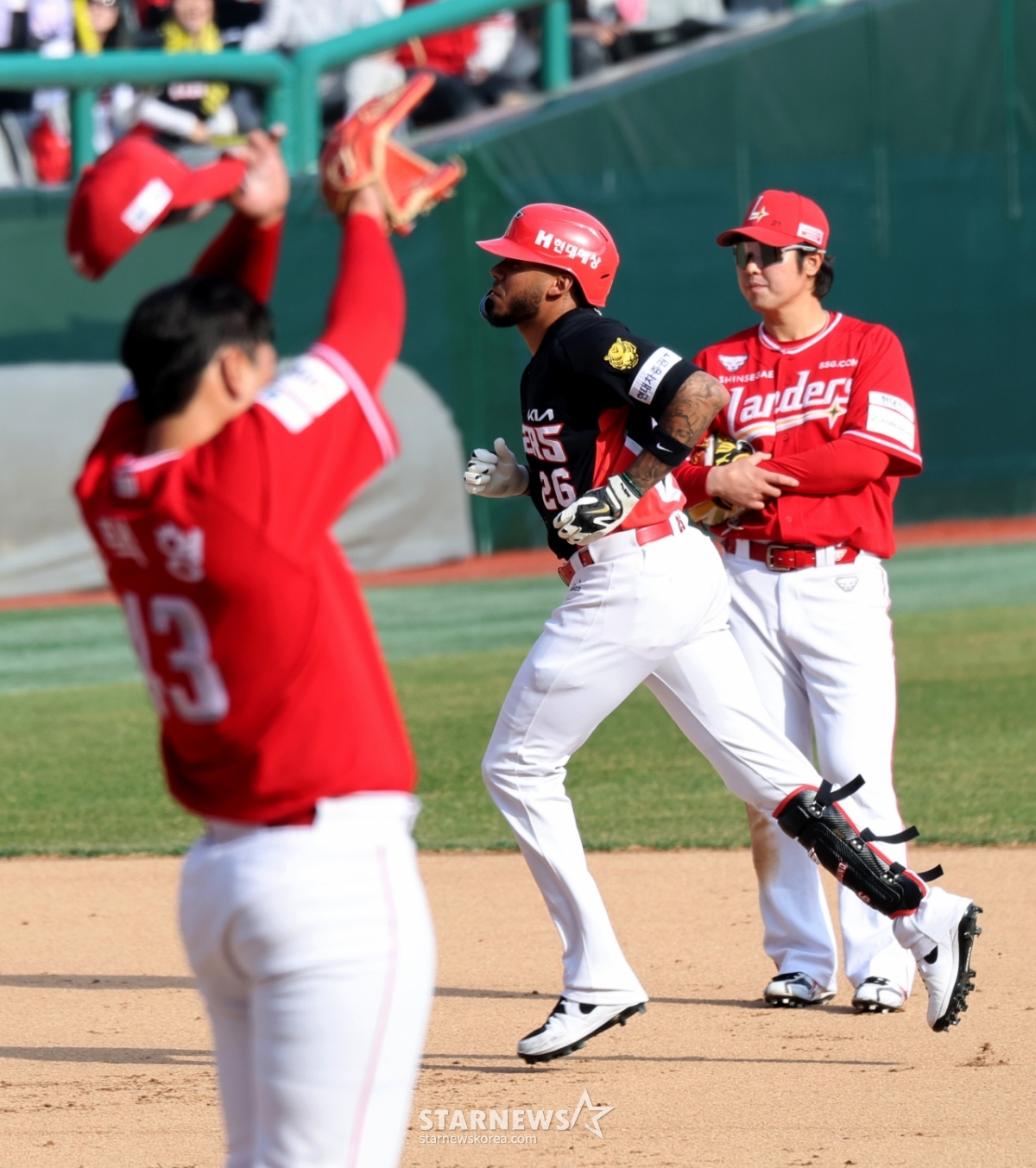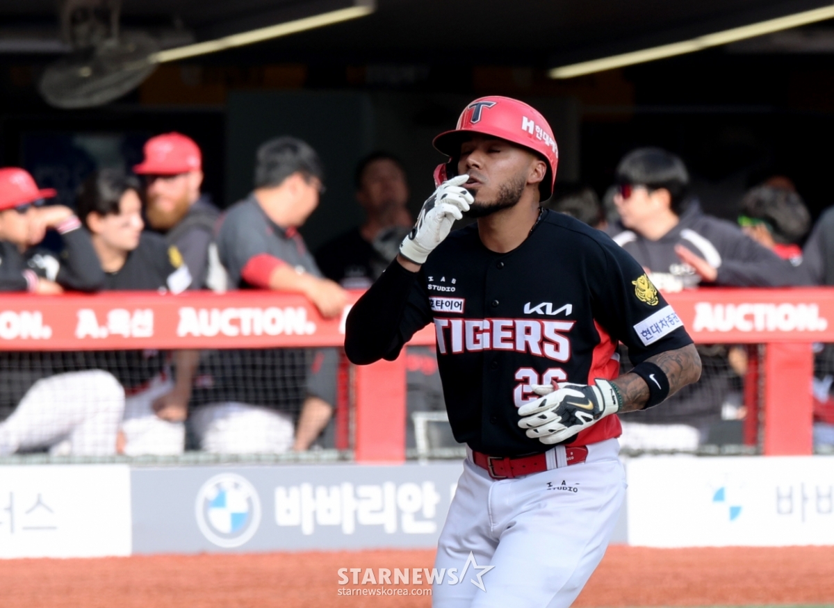29日,在仁川SSG兰德斯球场举行的2026职业棒球SSG兰德斯队与起亚虎队的比赛第7回合初,起亚队2人出局1人在垒的情况下,面对金泽铉击出优越2分本垒打后,正在返回本垒。 2026.03.29.