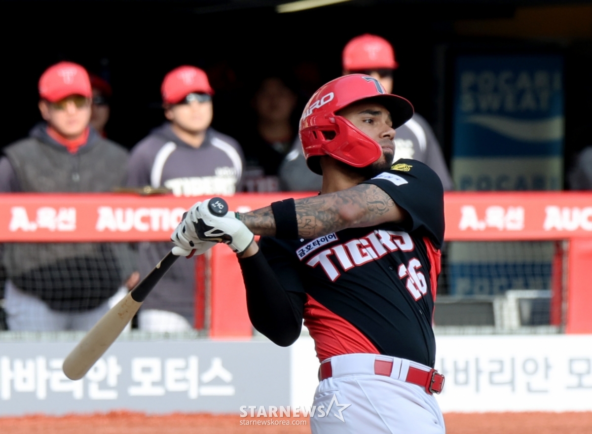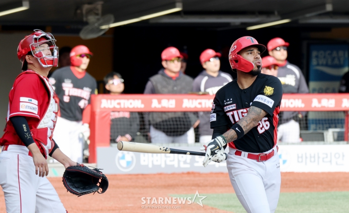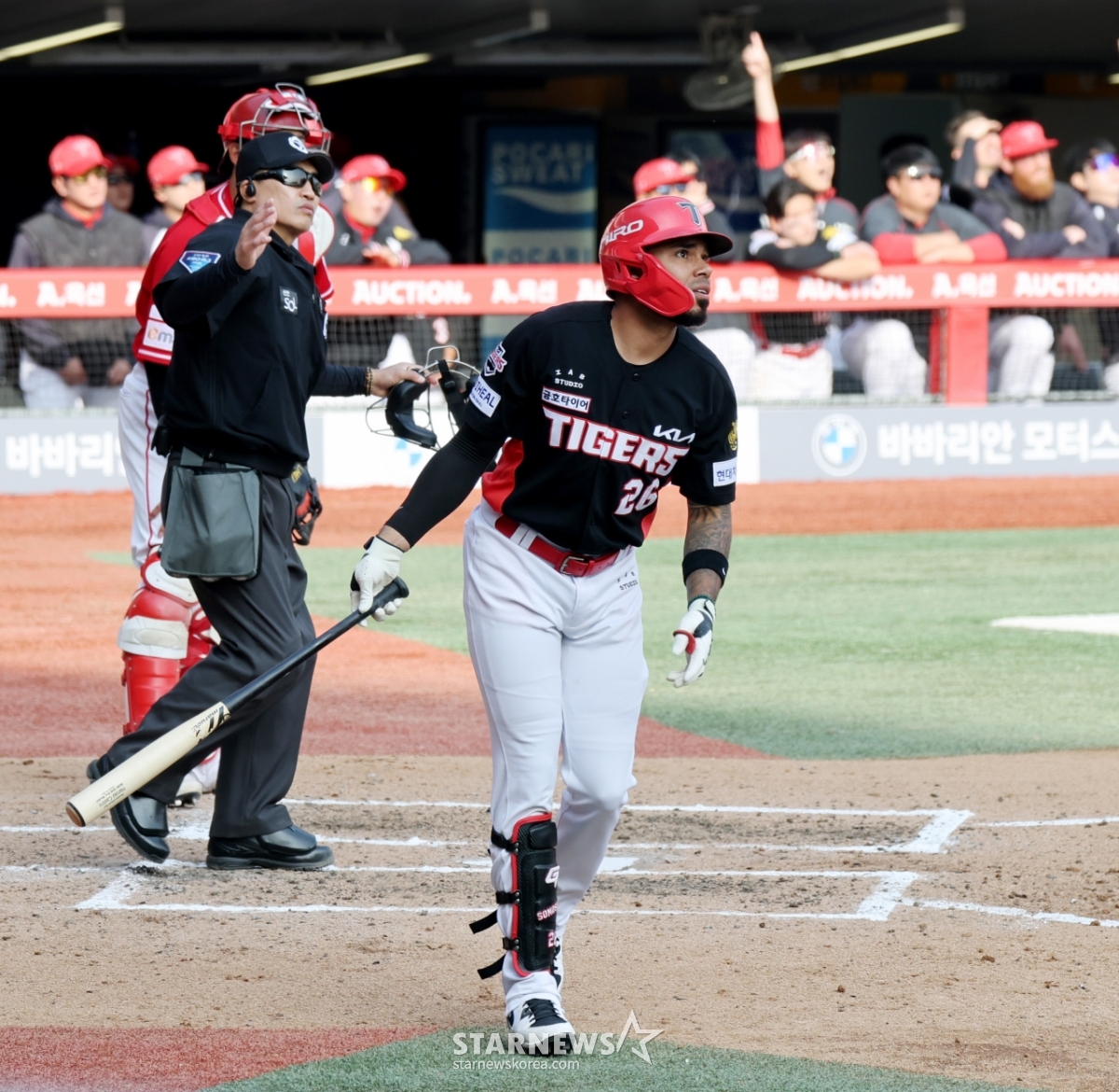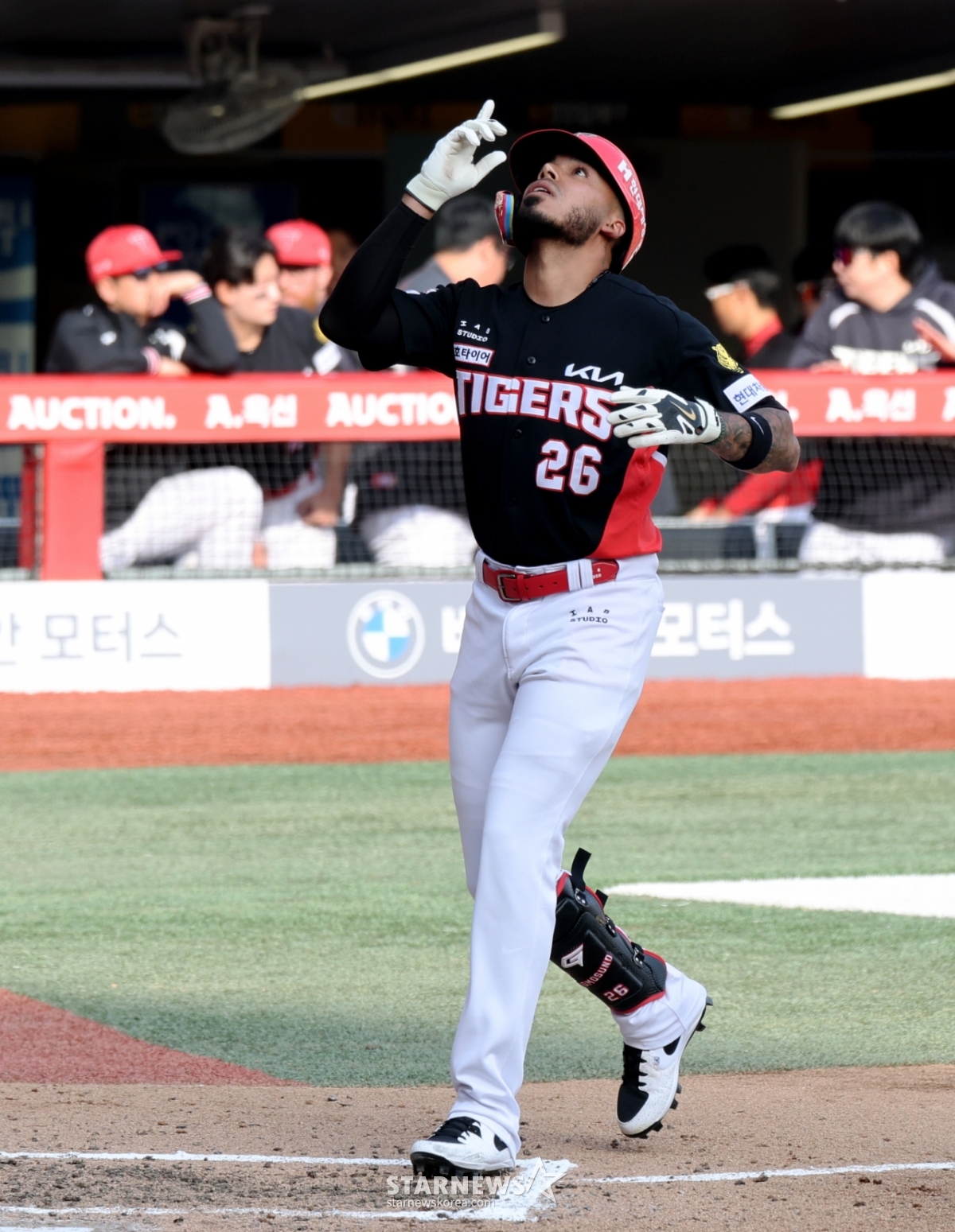 29日,在仁川SSG兰德斯球场举行的2026职业棒球SSG兰德斯队与起亚虎队的比赛第7回合初,起亚队2人出局1人在垒的情况下,面对金泽铉击出优越2分本垒打后,正在返回本垒。 2026.03.29.
